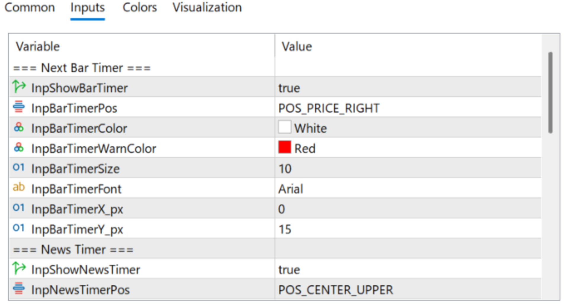 InpBarTimerColor / InpBarTimerWarnColor: Colors for normal and warning states.