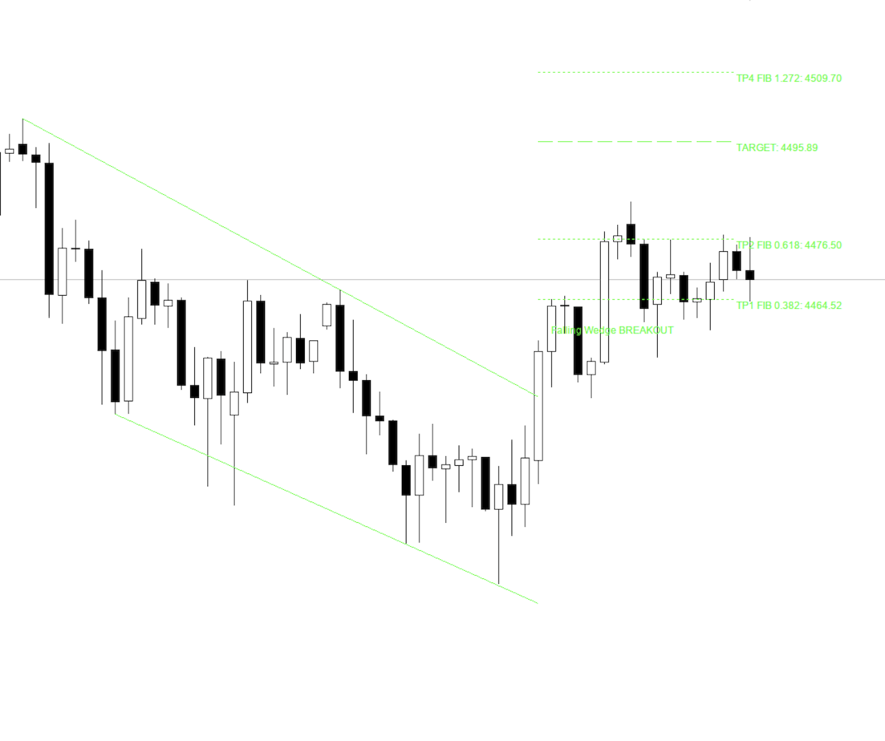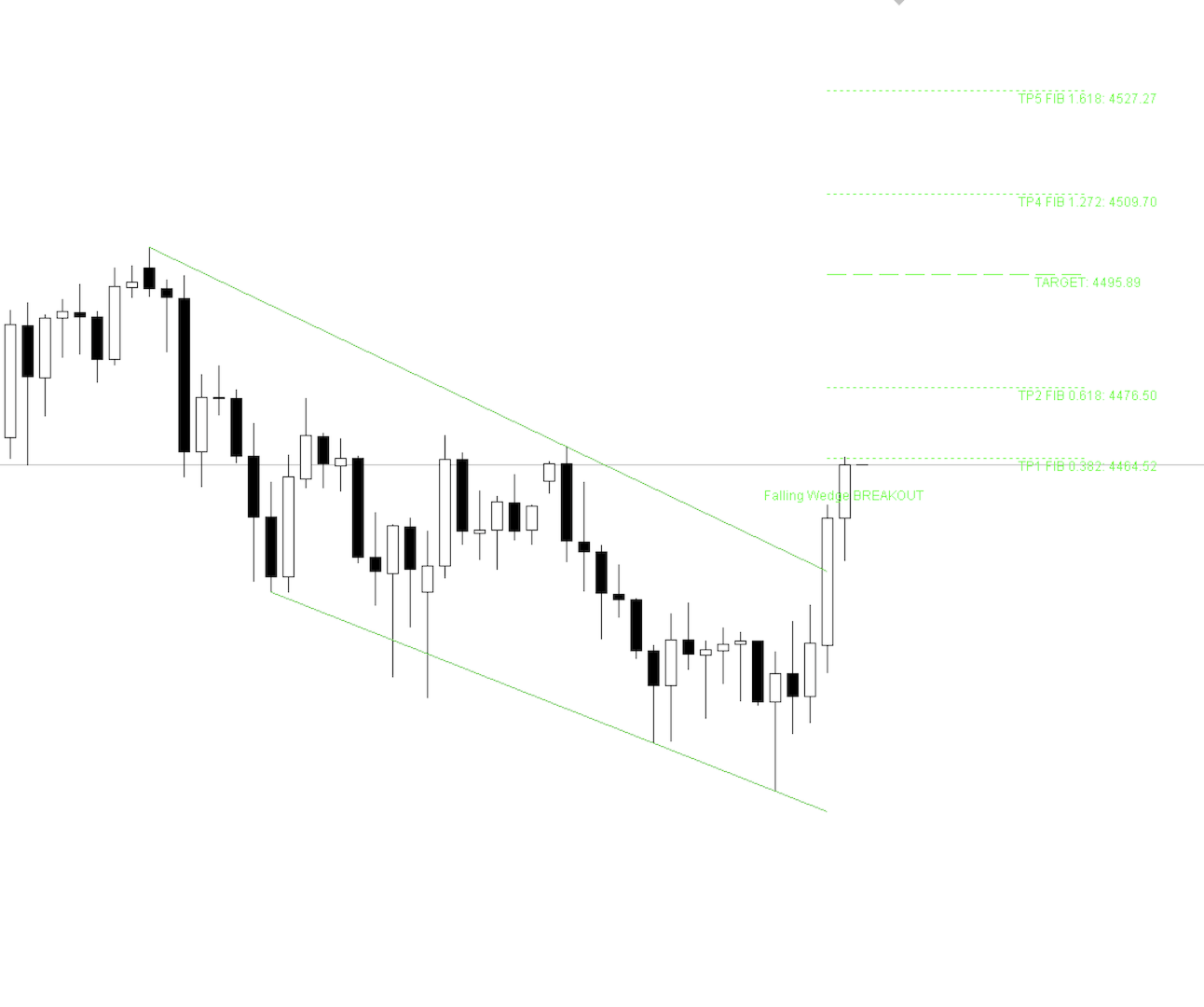 Calcola gli obiettivi automaticamente: In seguito a un breakout, il sistema calcola istantaneamente la distanza dell'Obiettivo Principale (Main Target) in base alla larghezza dell'apertura del cuneo, permettendoti di sapere esattamente dove impostare il tuo Take Profit.