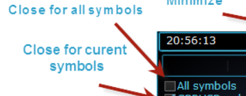 The control panel closes by the general profit or loss in dollars, pips and % of the balance. The panel can be used as a virtual stop loss or take profit. There is also an emergency button - Close ALL.