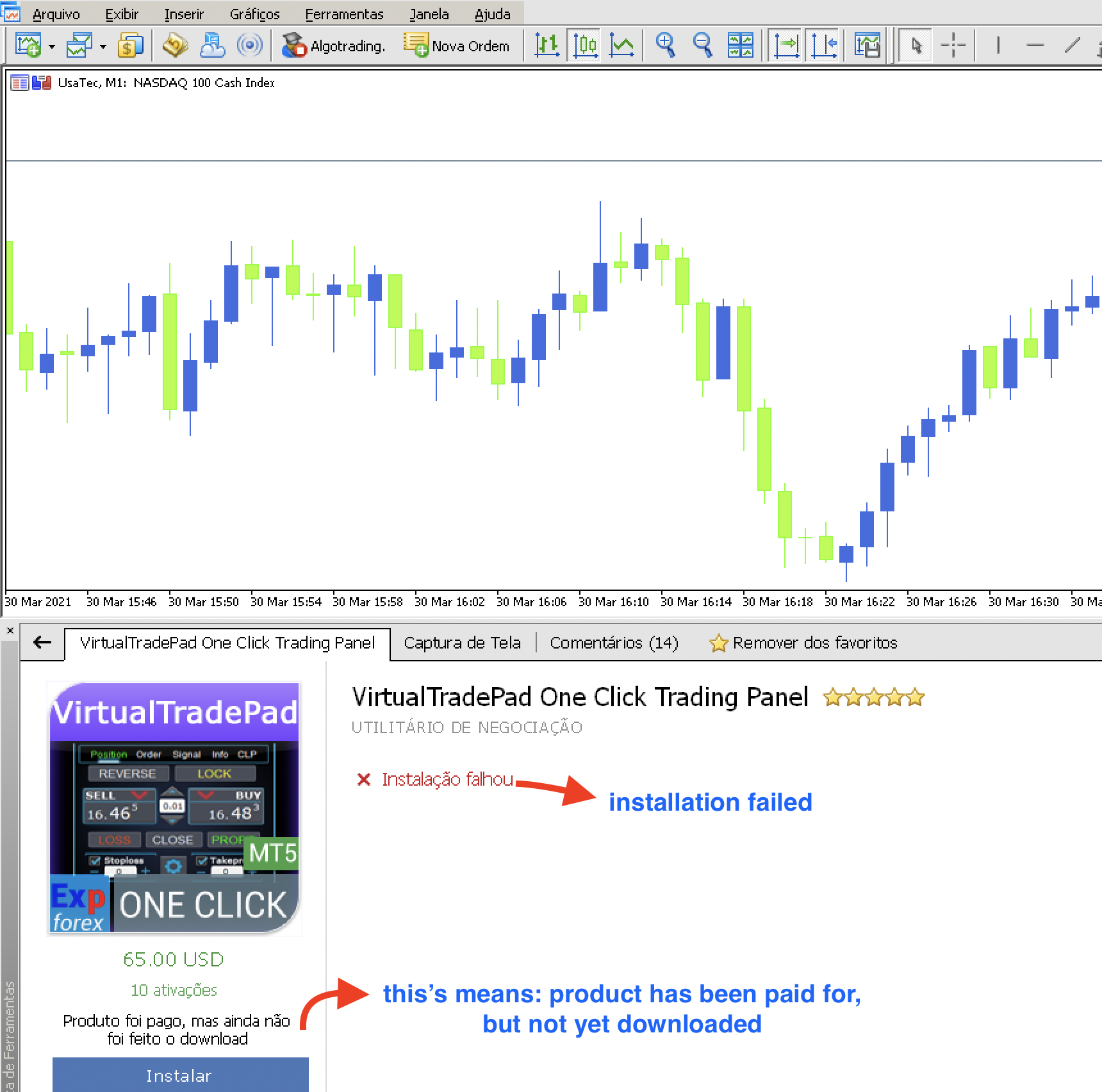 I'm having trouble installing virtualtradepad on MetaTrader5 for MAC. After trying to install, the message that the installation failed appears. I already consulted your manual, but I was not able to solve this problem. Would you help me? Check the image attached