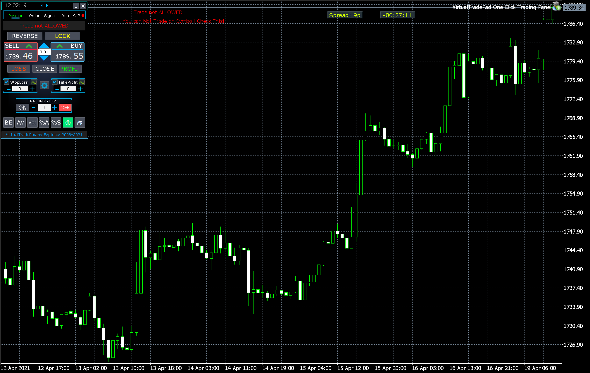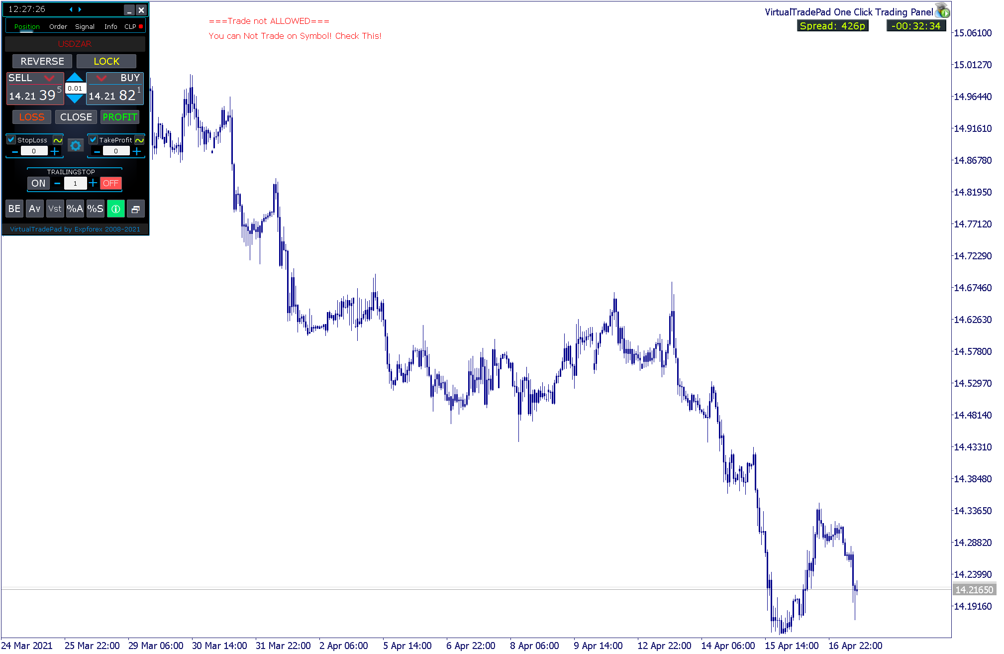 I woke up with an error message which I have never seen before in my last 2years of using VirtualTradePad ===Trade not ALLOWED=== You can not trade on Symbol! Check This. How do I remove the error. I tried loading the pad on other instruments but the error remains.