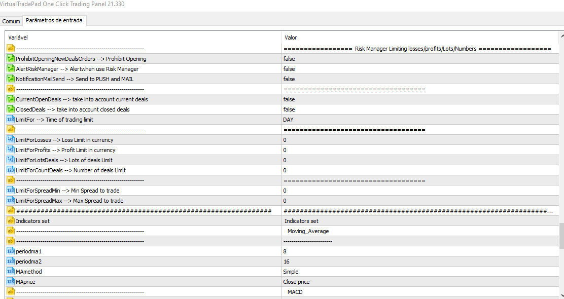 Gostaria de configurar (padronizar) o meu VTP para uma quantidade de operações diárias e também limites de perdas $$ e máximo limites de ganhos, estou em dúvida, você possui algum vídeo explicativo para eu assistir e tirar essas duvidas? A formatação que estou querendo realizar, acredito que próximo desse imprimir que estou enviando, porém nos limites de perdas e ganhos, eu informo o percentual ou o valor de limite?