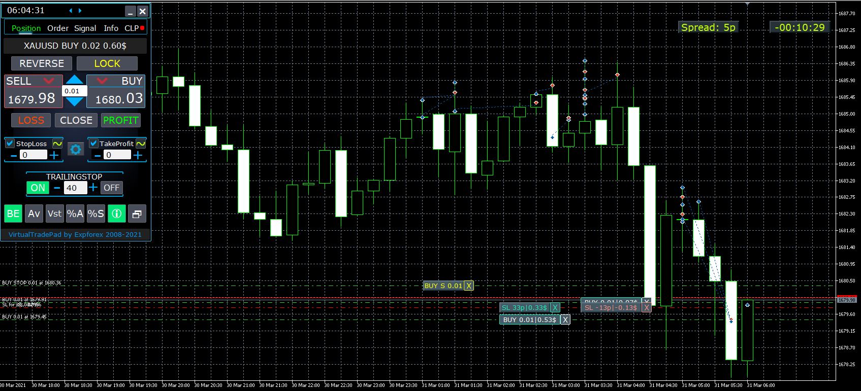 The real trailing stop is standard, using a breakeven, to set the first stop loss at a distance of 400 points, when a profit of 500 points is passed.
