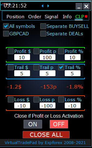--- The CPL_CloseAllCharts_per_CloseAllDeals parameter closes All charts (When All Symbols is enabled) or only those with a chart symbol = VirtualTradePad symbol.