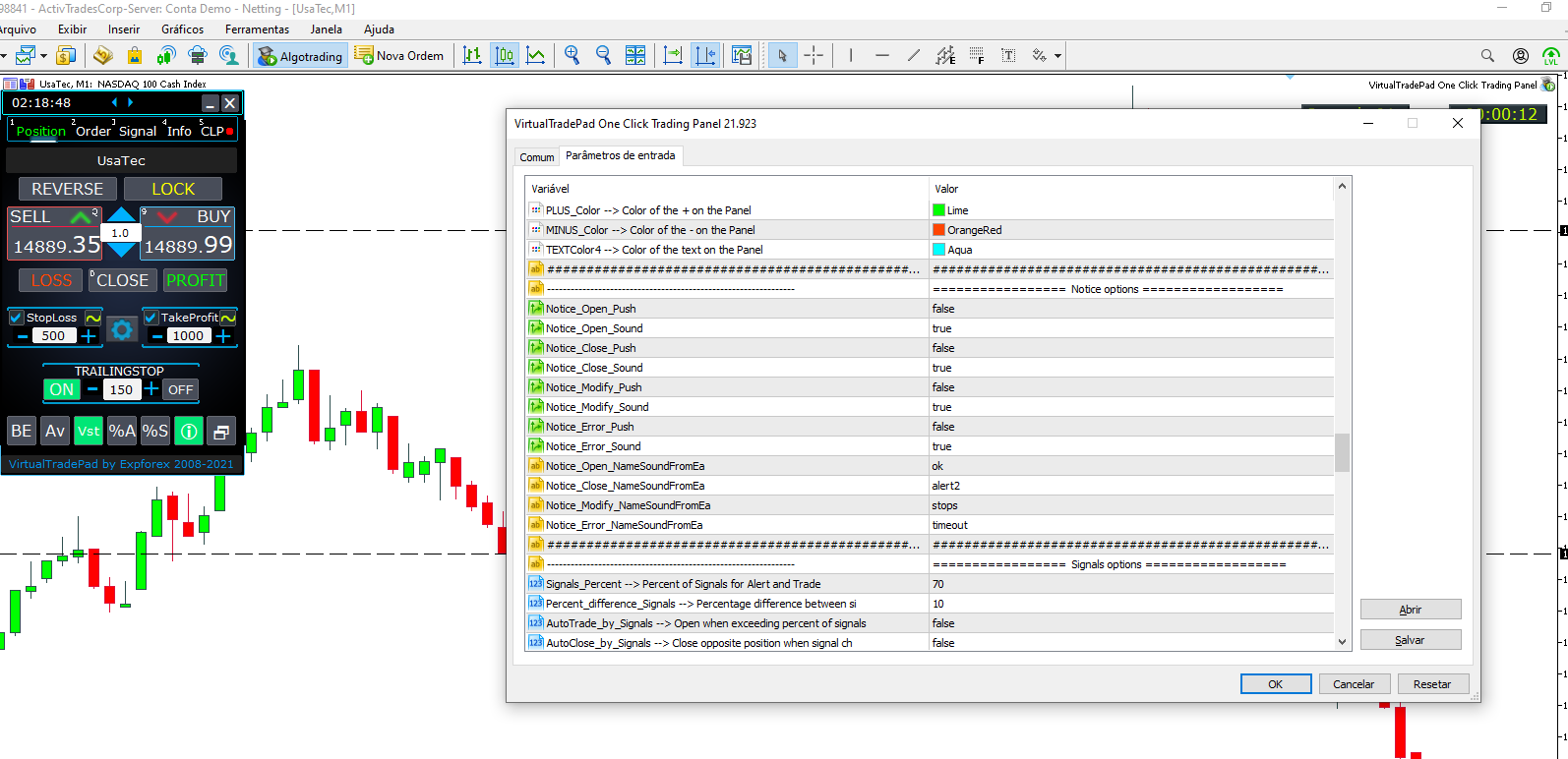 Na versão mais recente, o botão AV foi corrigido para Trailing Stop.