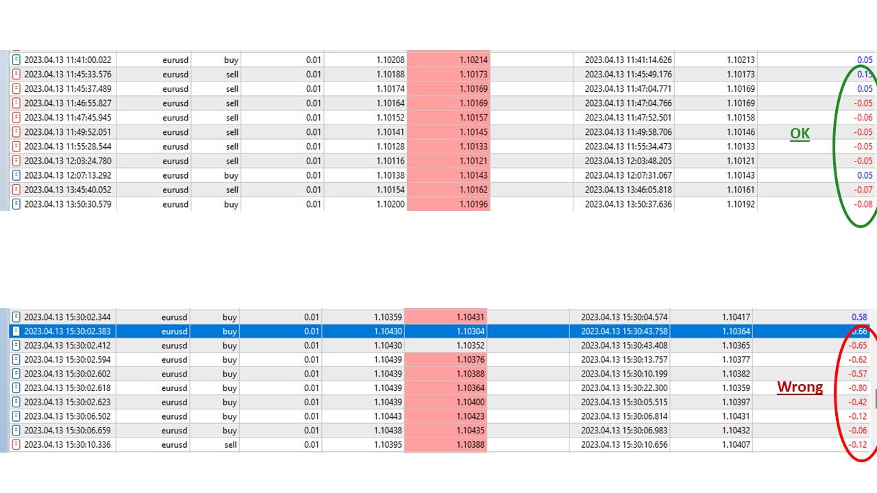 Ejemplo de stoploss ejecutado correctamente y del error cuando se tienen varías ordenes ejecutadas que no cierran correctamente en el nivel de stoploss establecido, en el ejemplo cerré las operaciones con el boton "Close" para cerrar todas las operaciones abiertas, el stoploss establecido en el traderpad nunca se activo