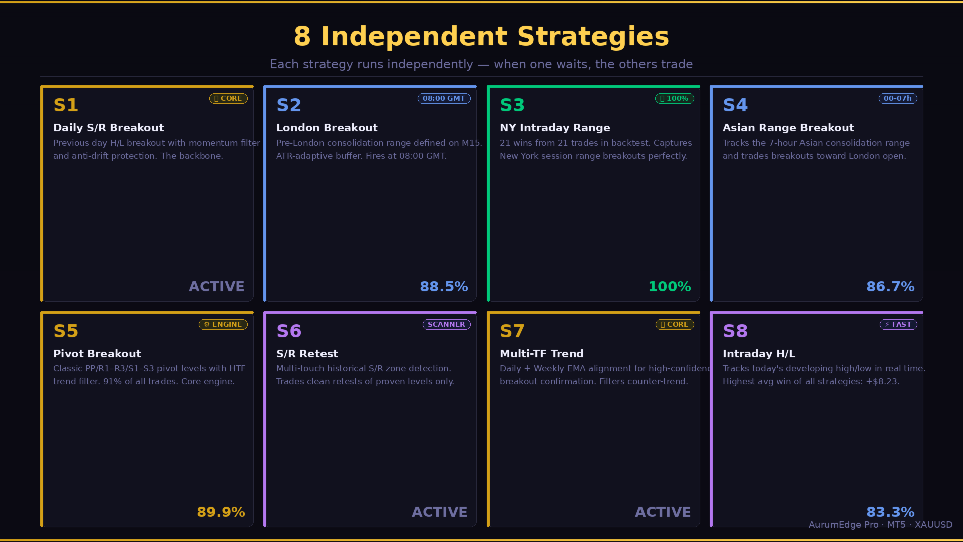 Most gold EAs rely on a single strategy that works in one market phase and fails in others. AurumEdge Pro is different — it fields 8 independent strategies simultaneously, each with its own logic, filters, and risk controls. When one strategy is waiting for its conditions, the others are active. This multi-strategy architecture is what produces consistent results across all market conditions and all sessions.