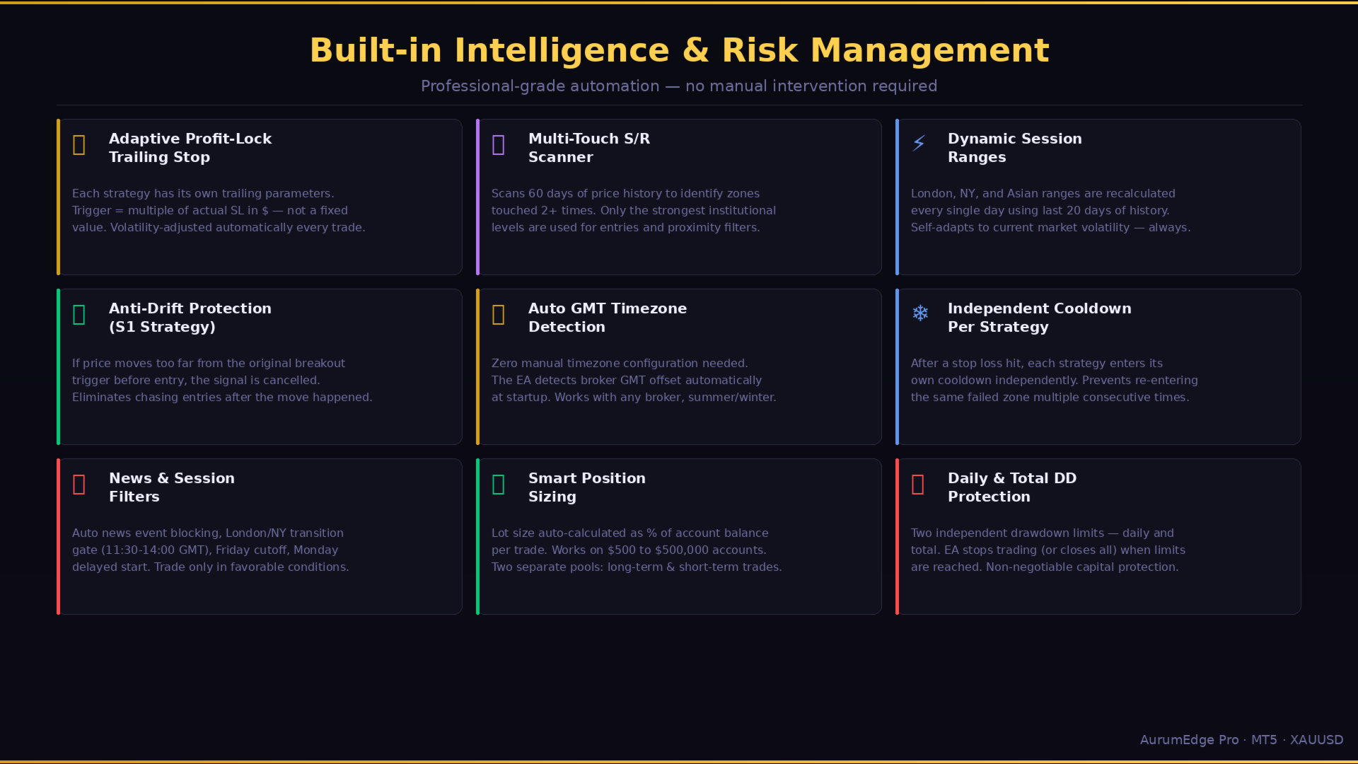- Adaptive Profit-Lock Trailing: Each strategy has its own trailing trigger — volatility-adjusted automatically (multiple of actual SL in $)