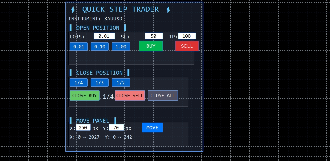 QuickStep Trader is a powerful yet intuitive manual trading panel designed for traders who prefer hands‑on execution. With a clean, fully customizable interface, it streamlines the process of opening and closing positions, letting you focus on your trading decisions.