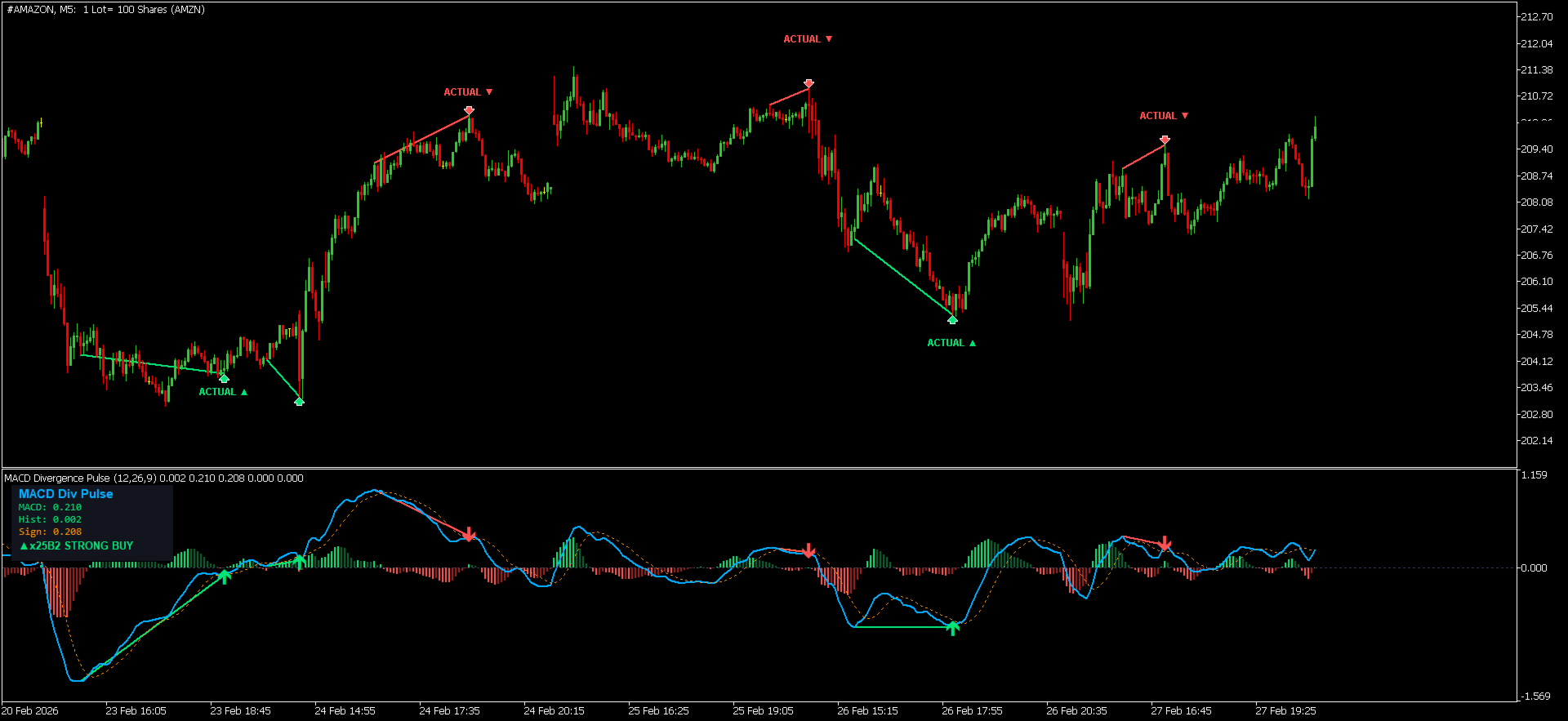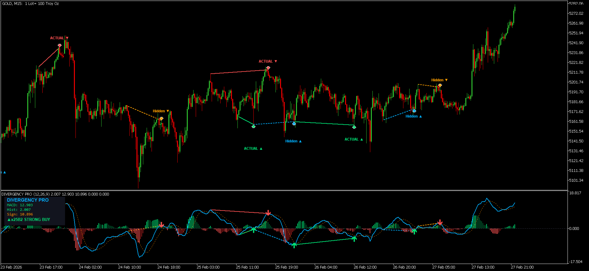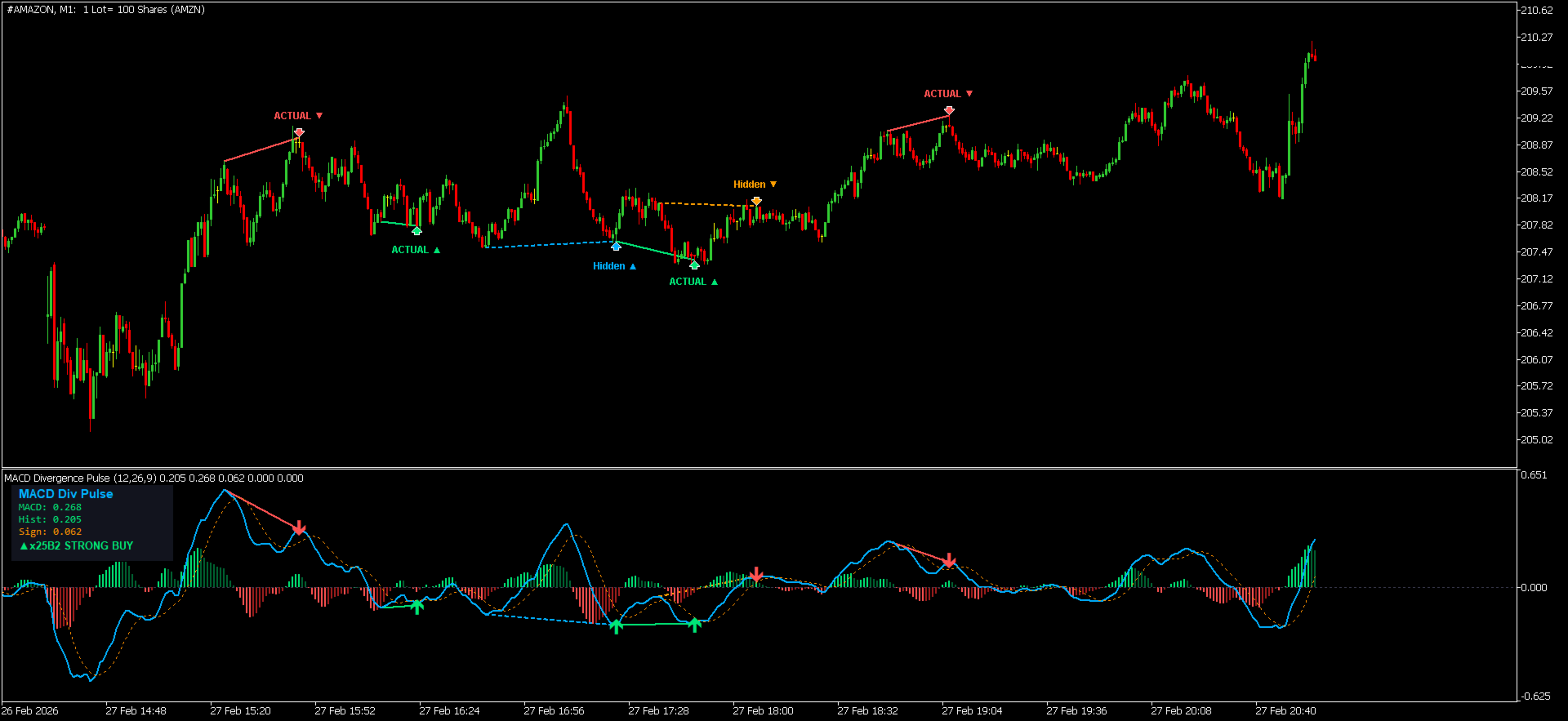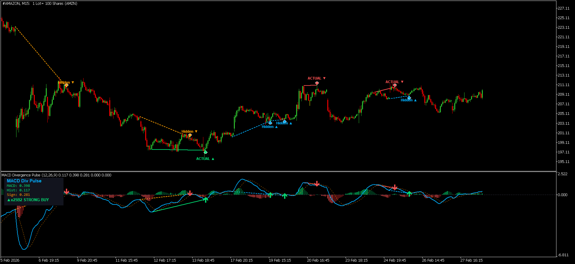 Indicatore MACD professionale con rilevamento automatico di divergenze regolari e nascoste, istogramma dinamico a 4 colori, frecce Buy/Sell, etichette segnali, dashboard in tempo reale e avvisi multicanale. Funziona su qualsiasi simbolo e timeframe.