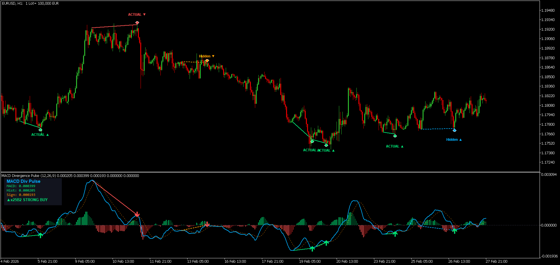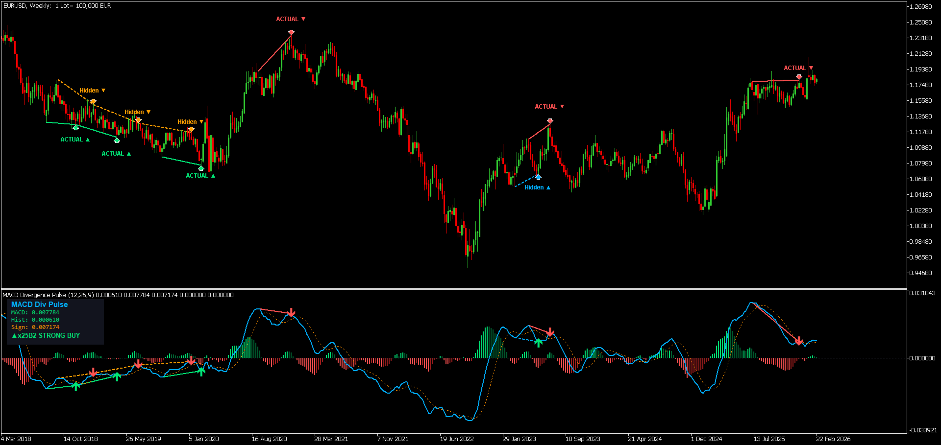 MACD Divergence Pulse porta l'oscillatore MACD classico al livello successivo. Rileva e mostra automaticamente divergenze regolari e nascoste, disegna linee sia sul grafico dei prezzi che nella sott finestra MACD, posiziona frecce, mostra etichette segnali e fornisce un dashboard live — tutto da un unico indicatore leggero.
