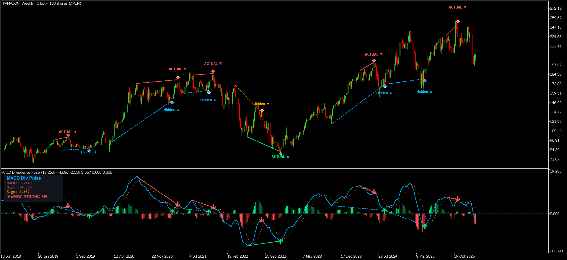 Etichette segnali — "ACTUAL" per setup inversione, "Hidden" per continuazione — senza congetture.