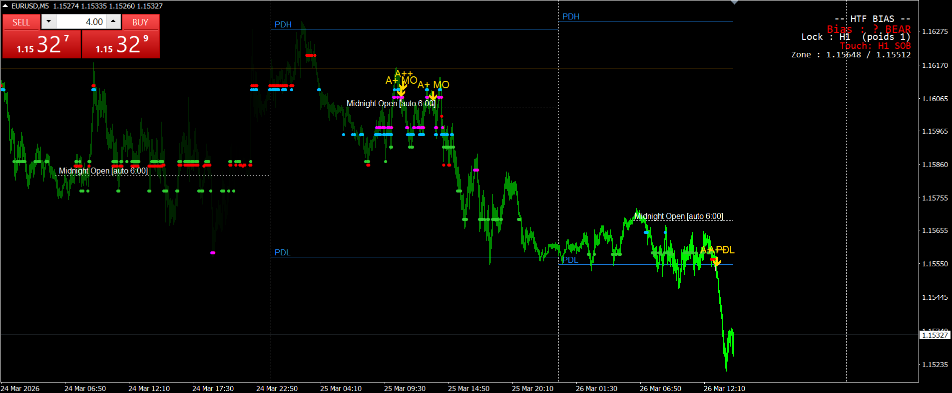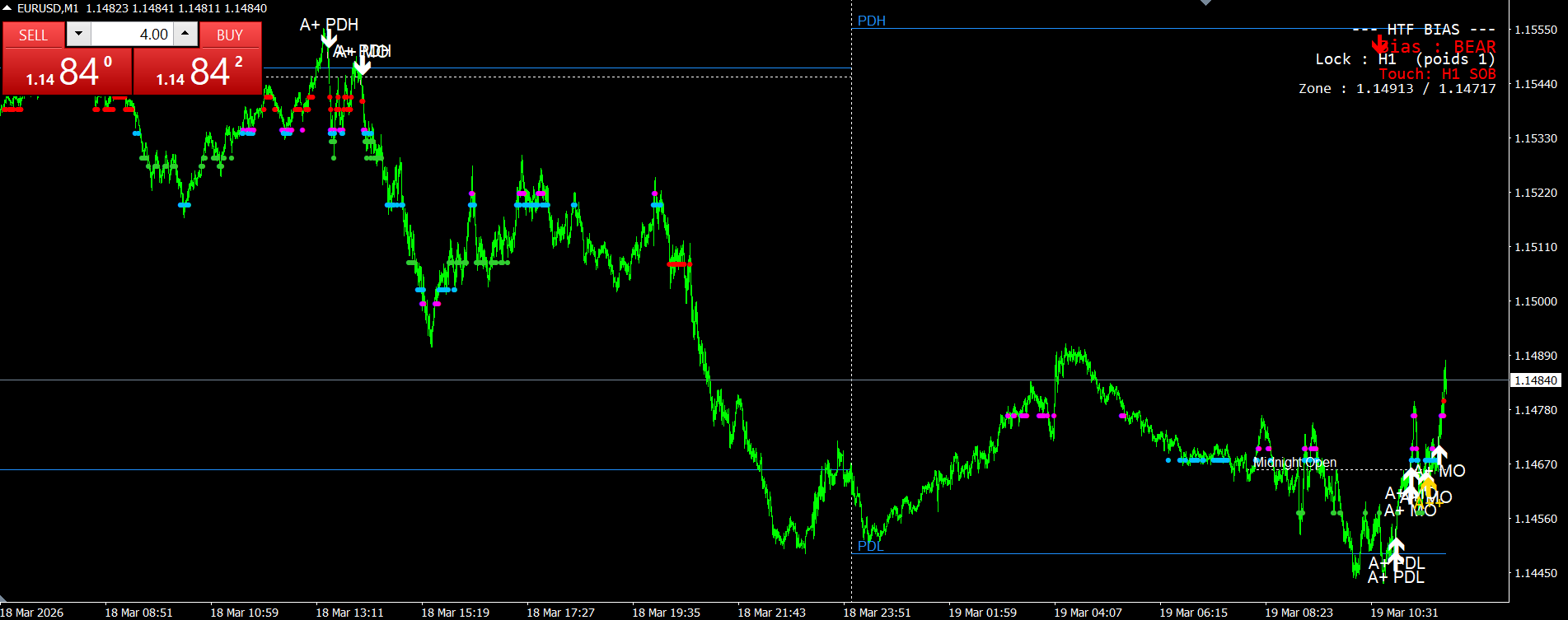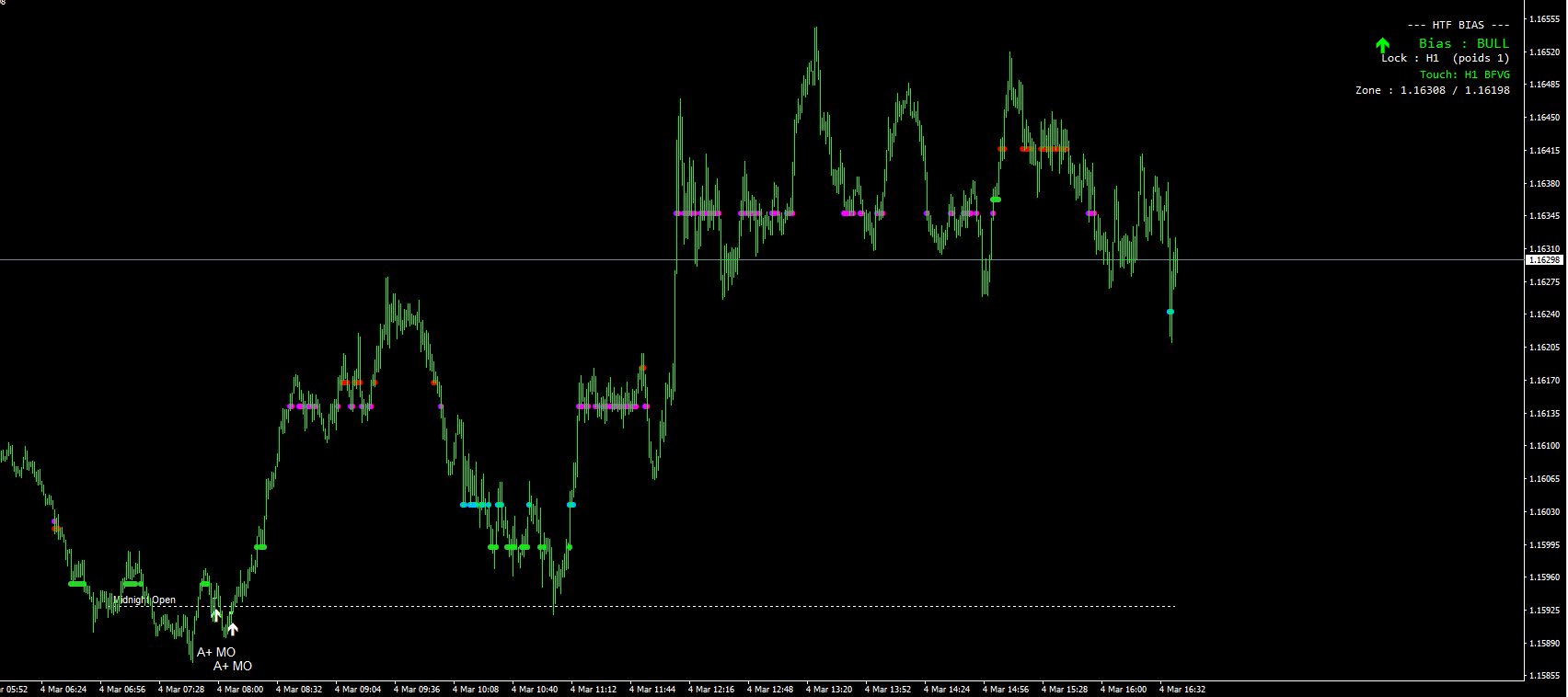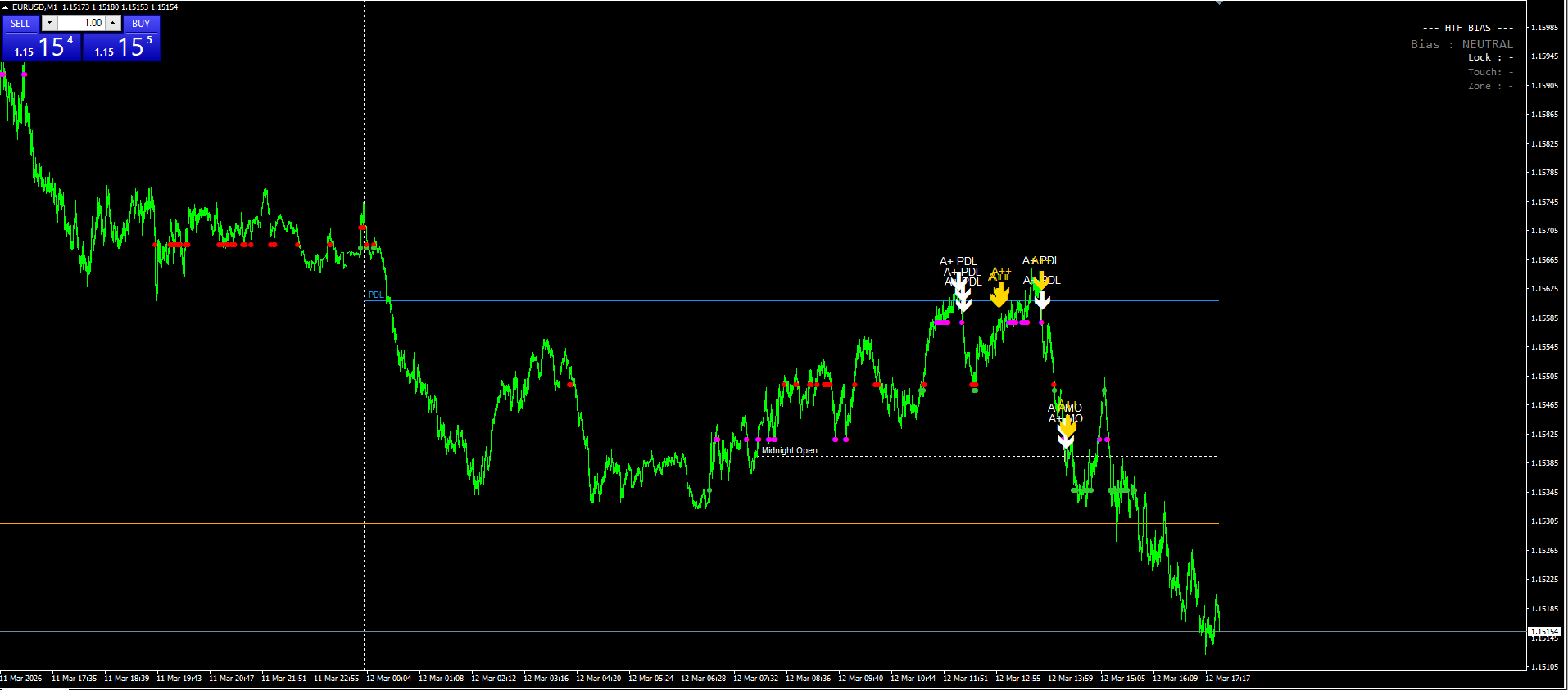 While the indicator is built with a sophisticated multi-timeframe weighting system that allows you to scan for Order Blocks (OBs) and Fair Value Gaps (FVGs) across several timeframes simultaneously, we strongly advise against mixing them. Blending multiple timeframes can often lead to conflicting biases, analysis paralysis, and unnecessary chart clutter. For the highest probability setups and a crystal-clear institutional edge, we highly recommend choosing only one primary Higher Timeframe (such as H1 or H4) to establish your directional bias, and disabling the others in the settings.