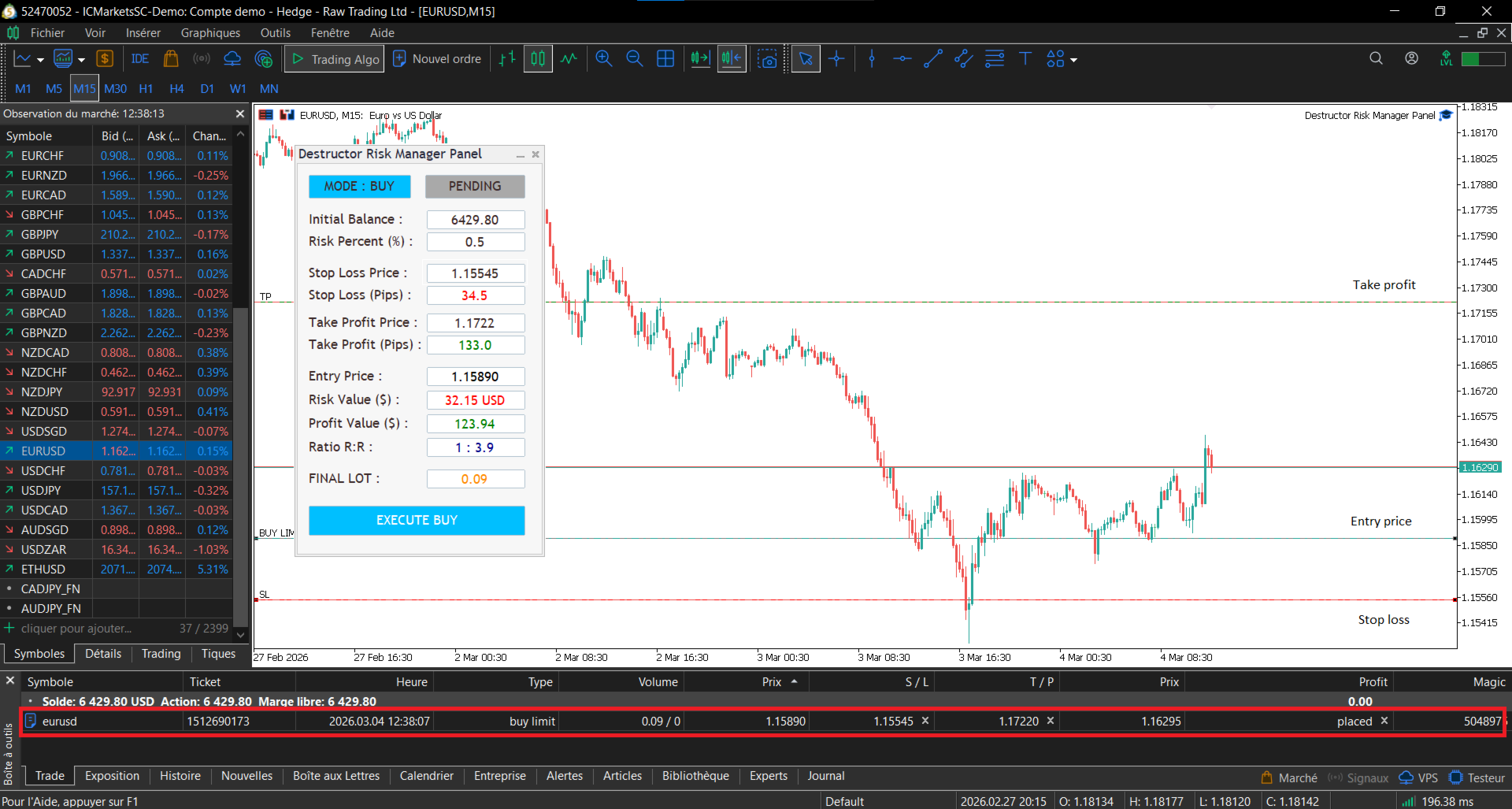 Automatic Lot Calculation: Instant calculation based on your risk percentage (%) and Stop Loss distance.