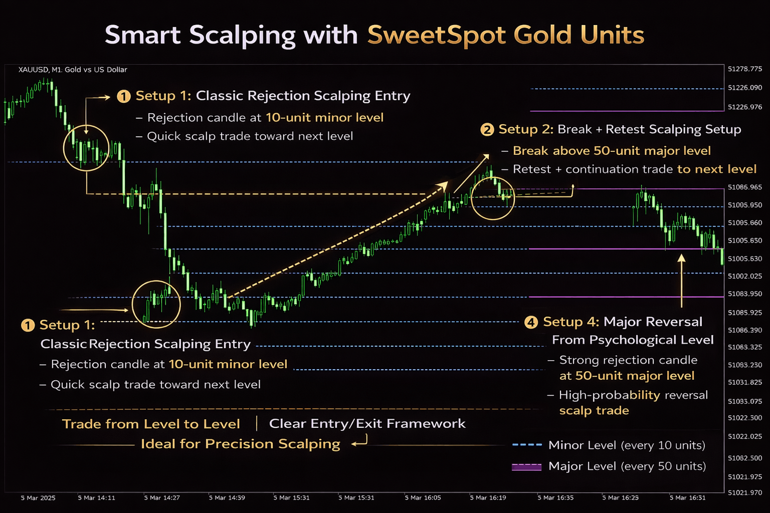 • Minor levels (e.g., every 10 units) for precision scalping entries