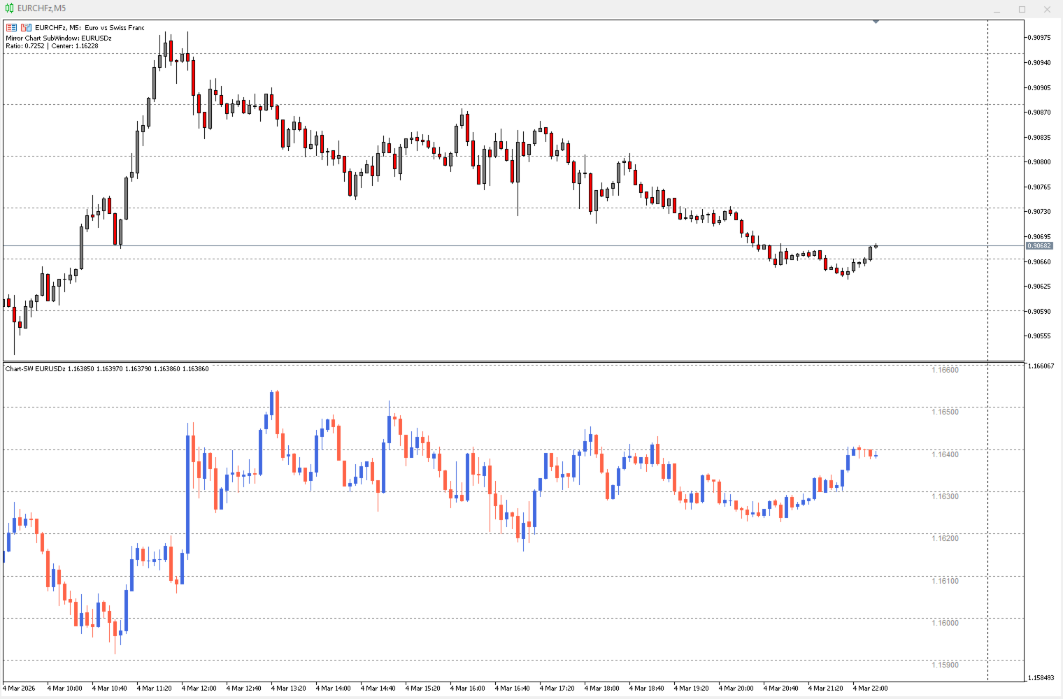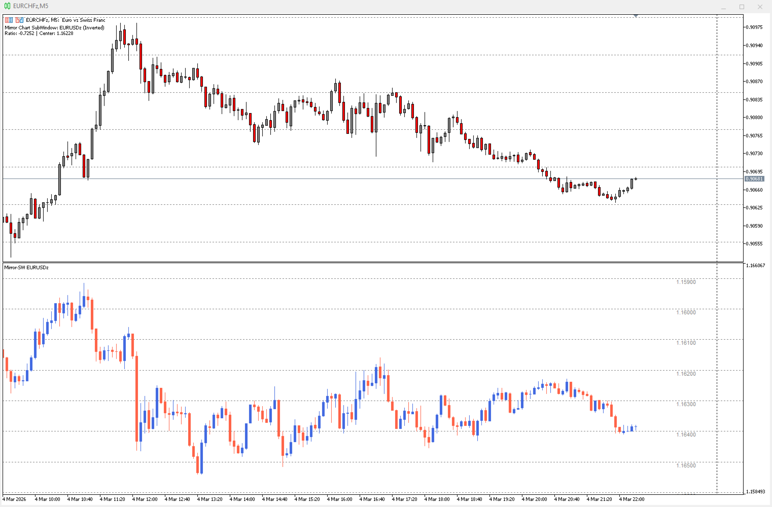 The Mirroring function vertically inverts the second instrument around its visible price center. This is particularly powerful when analyzing negatively correlated pairs such as EUR/USD and USD/CHF, as opposing trends are visually aligned, making divergences and relative strength immediately apparent.