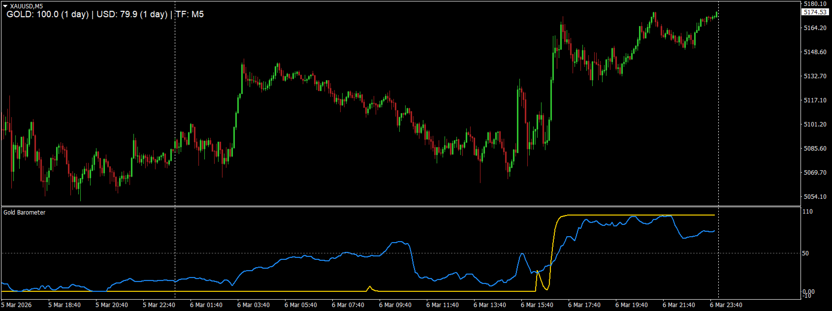 Gold Barometer is a dual-line strength indicator that measures relative momentum between Gold (XAUUSD) and the US Dollar. It calculates percentage change over a flexible lookback period (minutes, hours, or days), converts it into a normalized 0–100 strength scale, and smooths it with EMA filtering for cleaner signals.