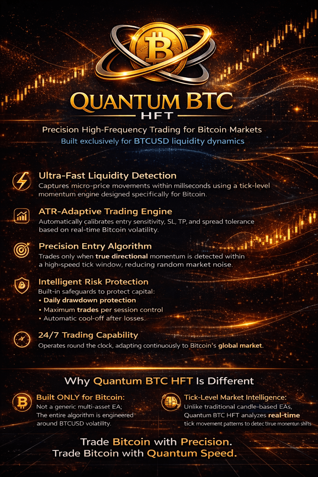 Quantum BTC HFT is a specialized high-frequency trading Expert Advisor designed exclusively for Bitcoin (BTCUSD) and Bitcoin-related symbols such as BTCUSD.m, BTCUSD+, BTC, and broker-specific variants.