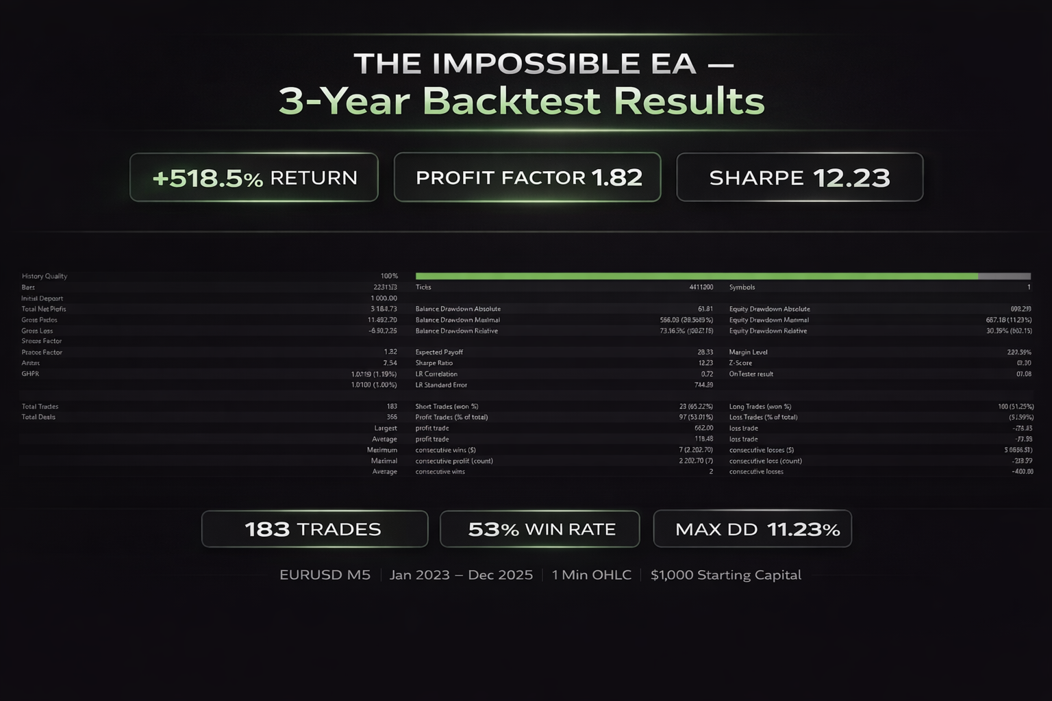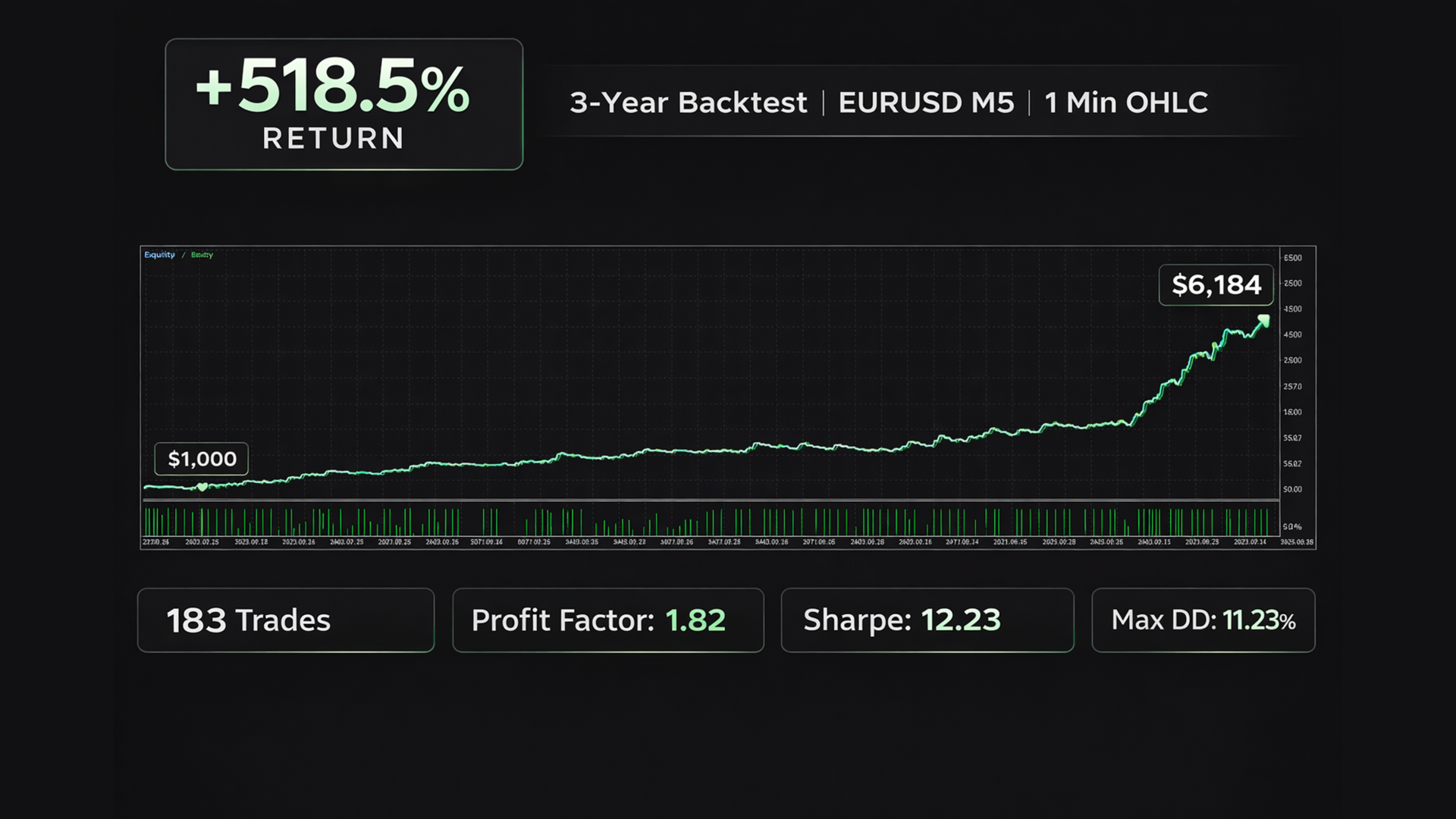 +518.5% 3-YEAR RETURN | 183 TOTAL TRADES | 53.0% WIN RATE | 11.23% MAX DRAWDOWN |