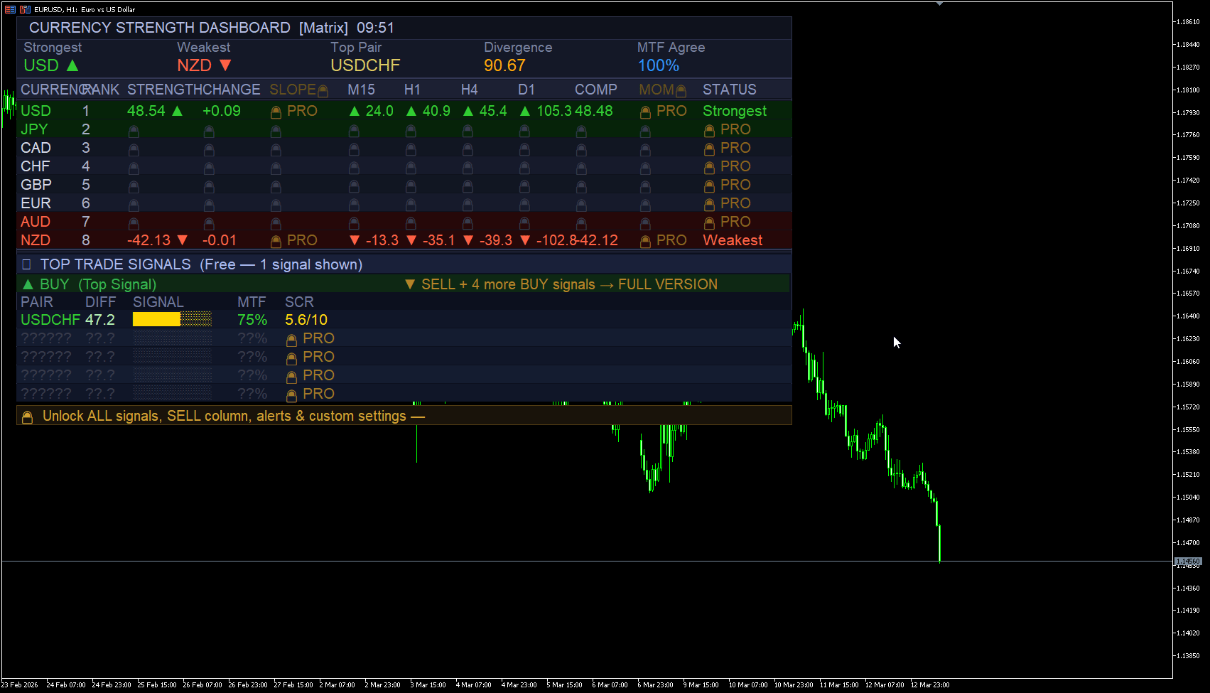 Versione gratuita del pannello professionale Currency Strength Dashboard Pro per MetaTrader 5.
