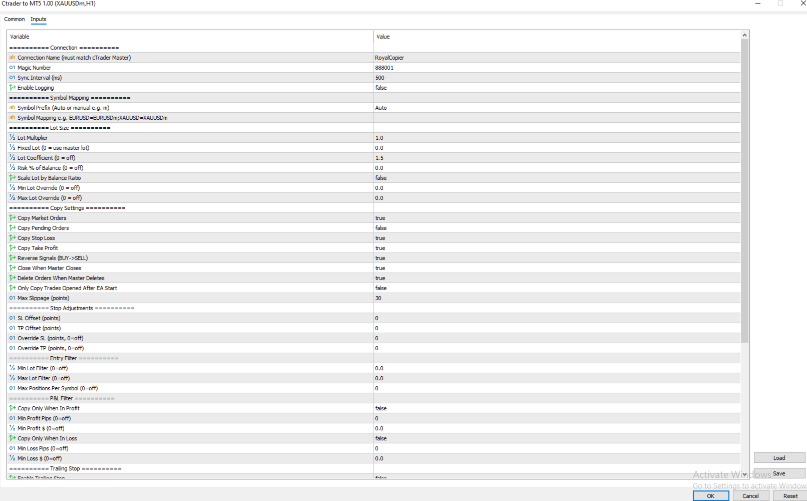 Configura dimensione del lotto, filtri, modalità inversa, impostazioni di protezione e tutte le altre opzioni sul lato MT5 secondo necessità.