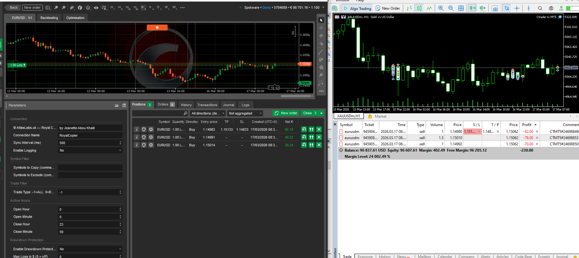 Una volta che sia il cTrader Master sia l'EA MT5 sono in esecuzione con lo stesso Connection Name, il sistema si collegherà e inizierà a copiare le operazioni.