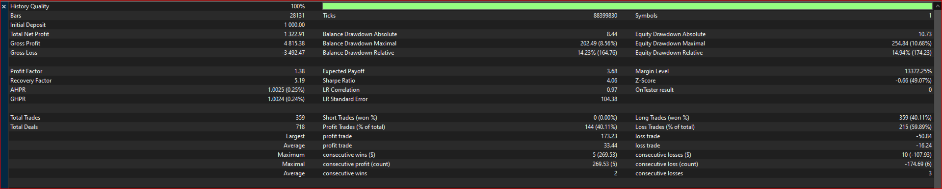 - <b>ATR-Based Stop Loss</b> — Stop loss is dynamically calculated using ATR × 2.5, adapting automatically to current market volatility. No fixed pip stops.
