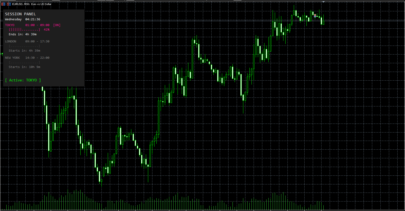 Session Panel puts the most important session information directly on the chart, helping you stay aware of active trading hours, overlaps, and upcoming session changes with less effort.
