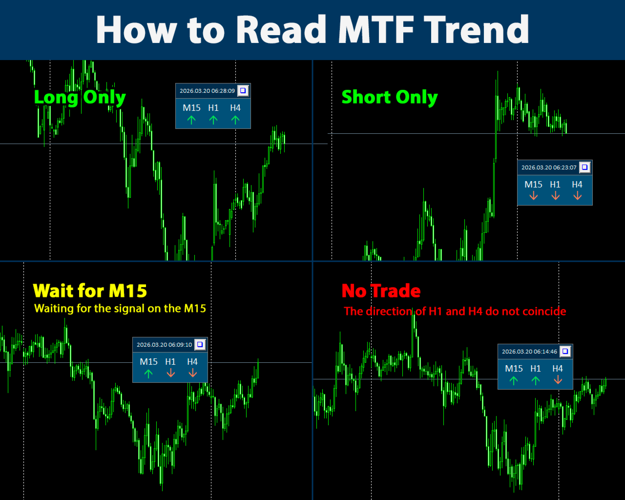 Uno degli errori più comuni dei trader è operare contro il timeframe superiore. MTF Trend risolve questo problema.