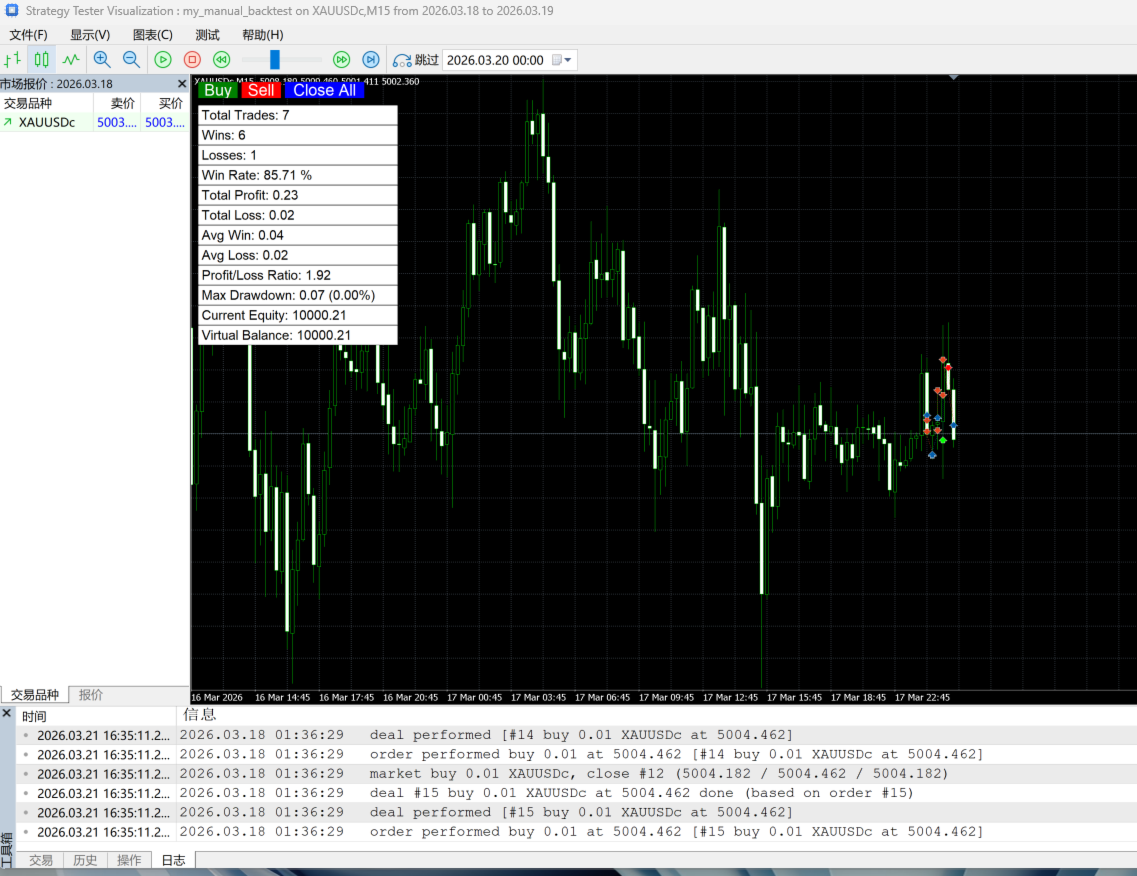 这是一款专为手动交易者设计的MT5工具。解决了MT5回测只能跑EA自动交易无法手动回测的问题。它通过图形化按钮(Buy / Sell / Close All)让您在图表上快速开平仓,并自动记录每一笔交易,实时计算胜率、盈亏比、平均盈亏、最大回撤、当前权益等专业数据,将您的交易行为转化为直观的绩效报告。它将是您不可或缺的辅助利器。