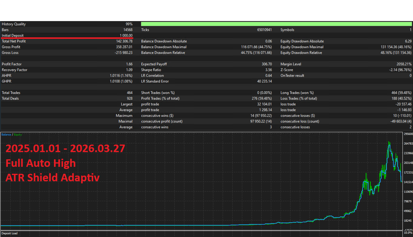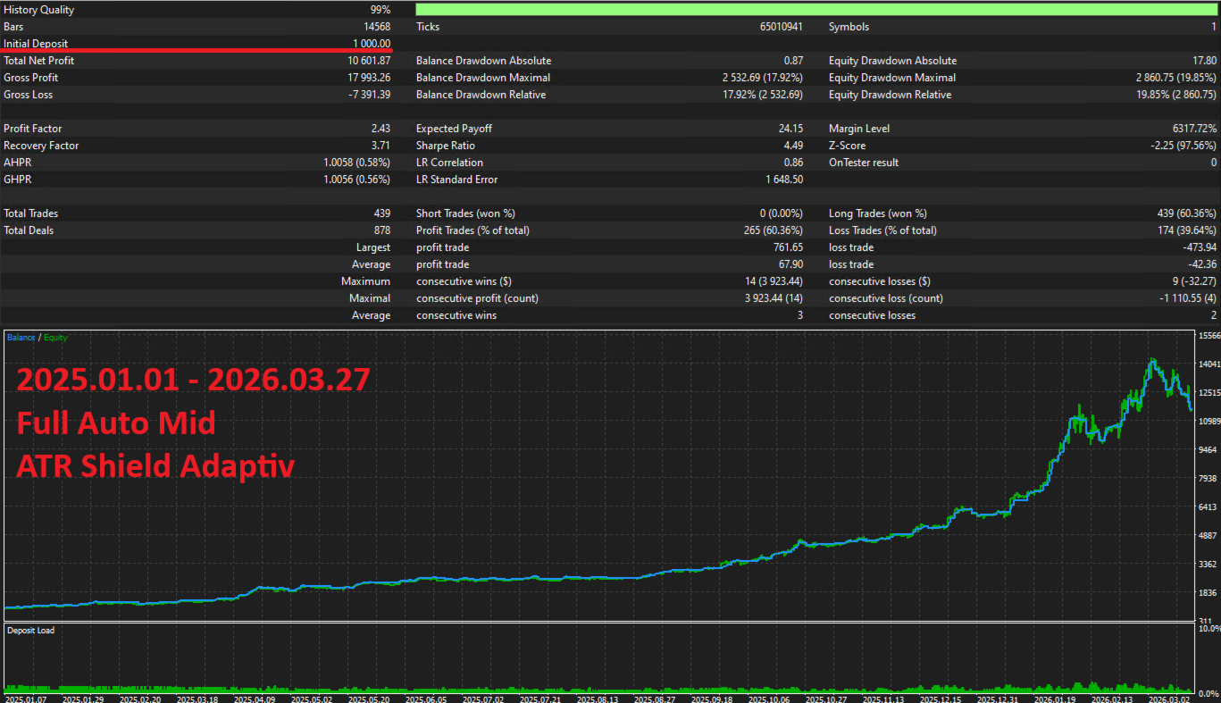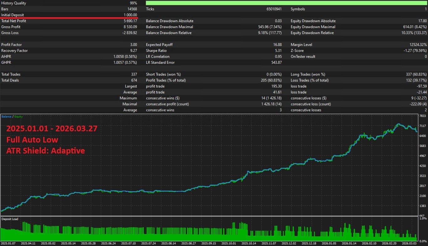 L'oro alterna periodi calmi a movimenti esplosivi. L'ATR Shield integrato rileva automaticamente la volatilita estrema e mette in pausa le nuove entrate fino a quando il mercato si calma. In modalita adattiva, confronta la volatilita corrente con la sua media storica — blocca solo durante picchi genuini, non durante mercati generalmente elevati. Le posizioni esistenti continuano ad essere completamente gestite.