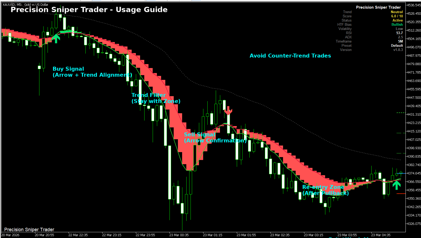Filtrando il rumore del mercato e concentrandosi solo su setup forti, Precision Sniper Trader ti permette di operare con fiducia e una maggiore precisione in diverse condizioni di mercato.