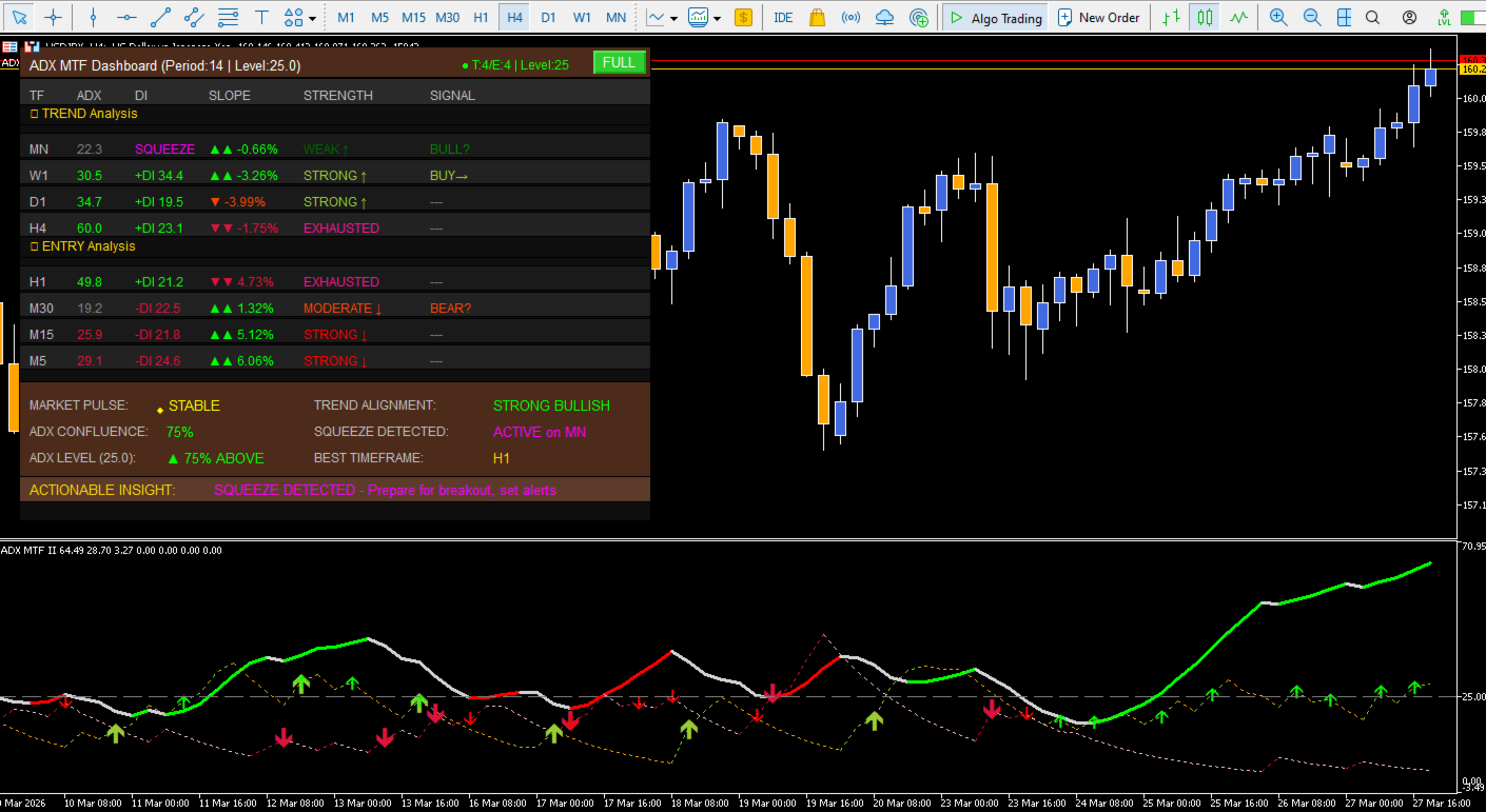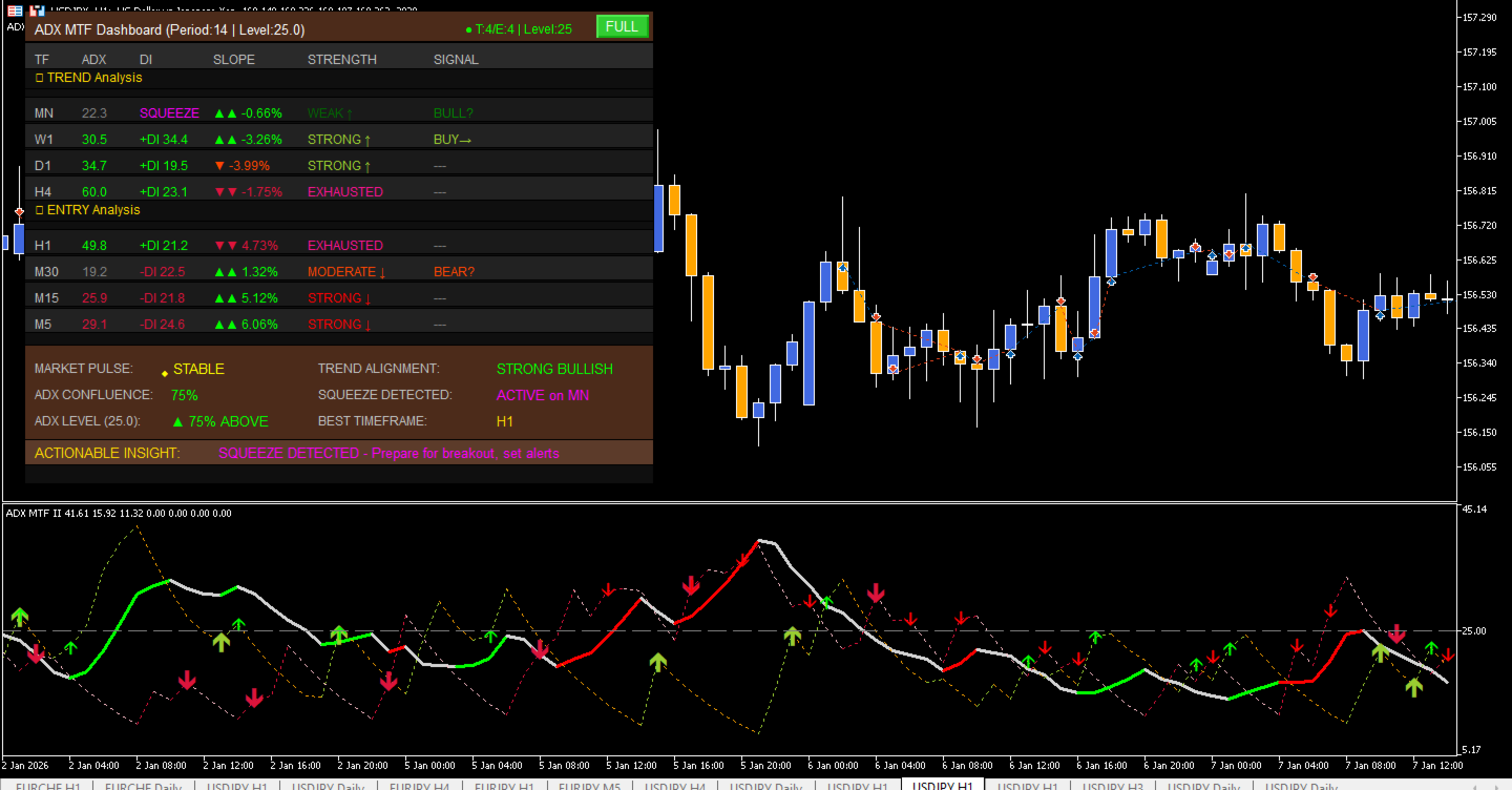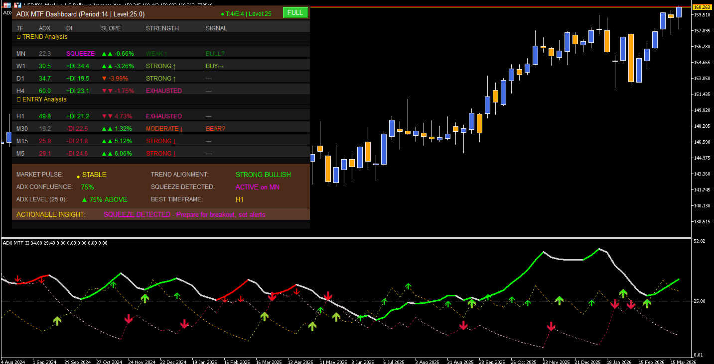 ADX Indicator, Multi-Timeframe, MTF Dashboard, Hull Moving Average, Trend Strength, Momentum Trading, DI Cross, Low Lag ADX, Trading Signals, MT5 Alerts, Trend Filter, Forex Strategy, Scalping Tool, ADX Level, Momentum Threshold, Trend Exhaustion, Breakout Detection, Squeeze Detection, Market Pulse, Trend Alignment, Actionable Insights, Trading Dashboard.