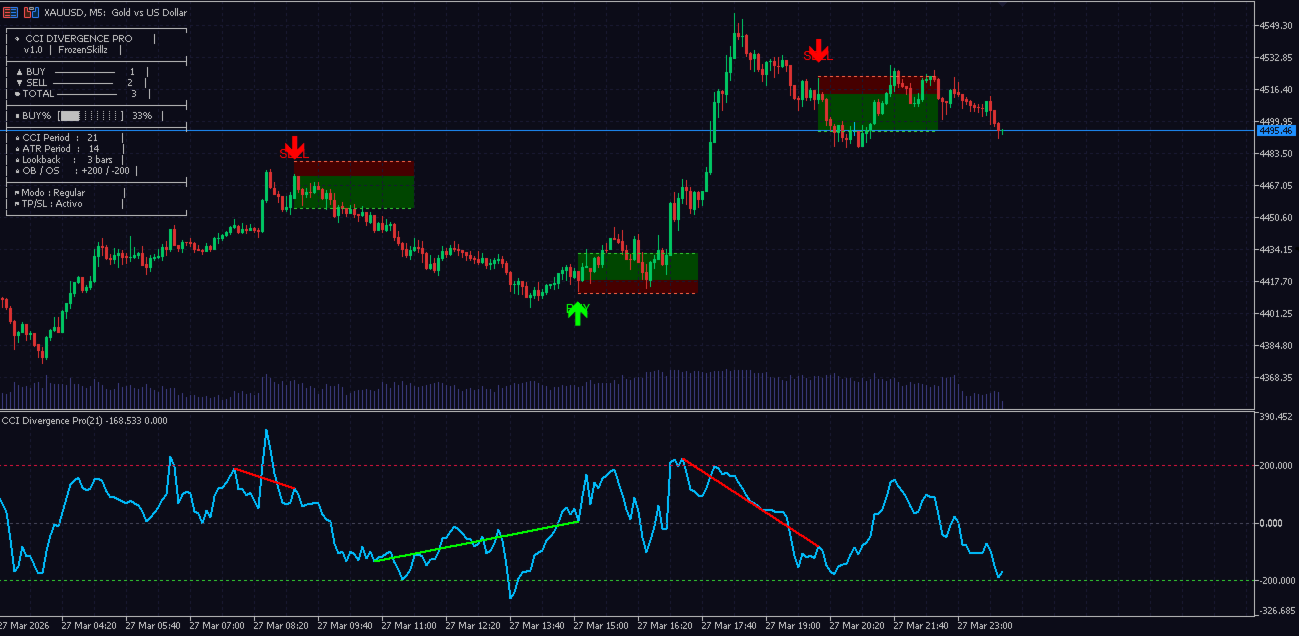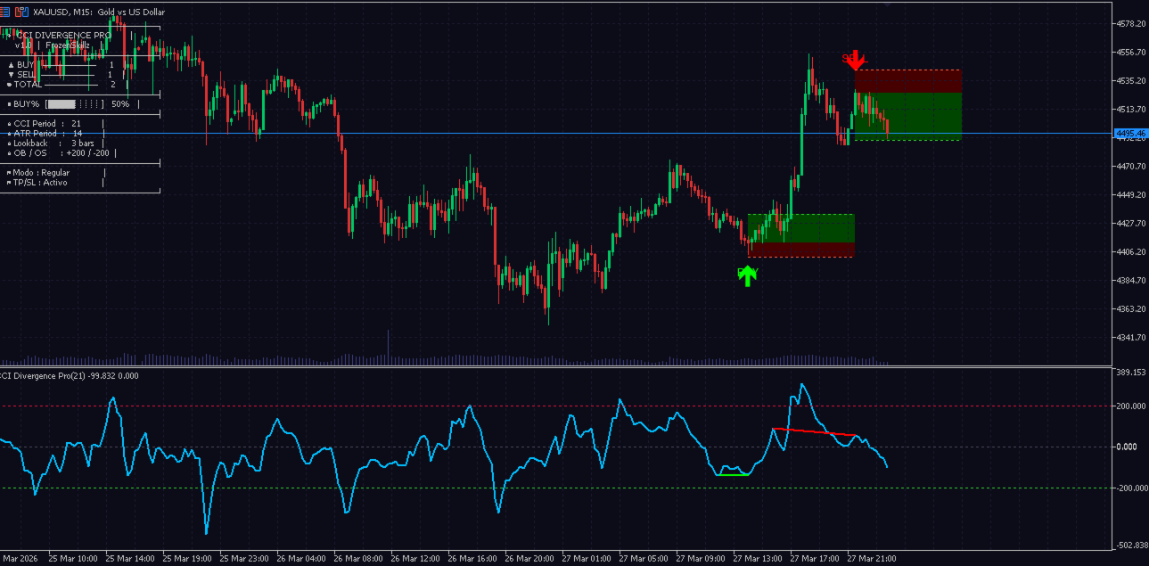 🥇 Why XAUUSD? Gold is volatile, impulsive, and consistently overextended—ideal conditions for CCI divergences to provide high-quality entry points. Moves of 200, 300, and even 500 pips in gold are frequently preceded by clear CCI divergences that are slow to be detected by the human eye. This indicator detects them automatically, bar by bar.