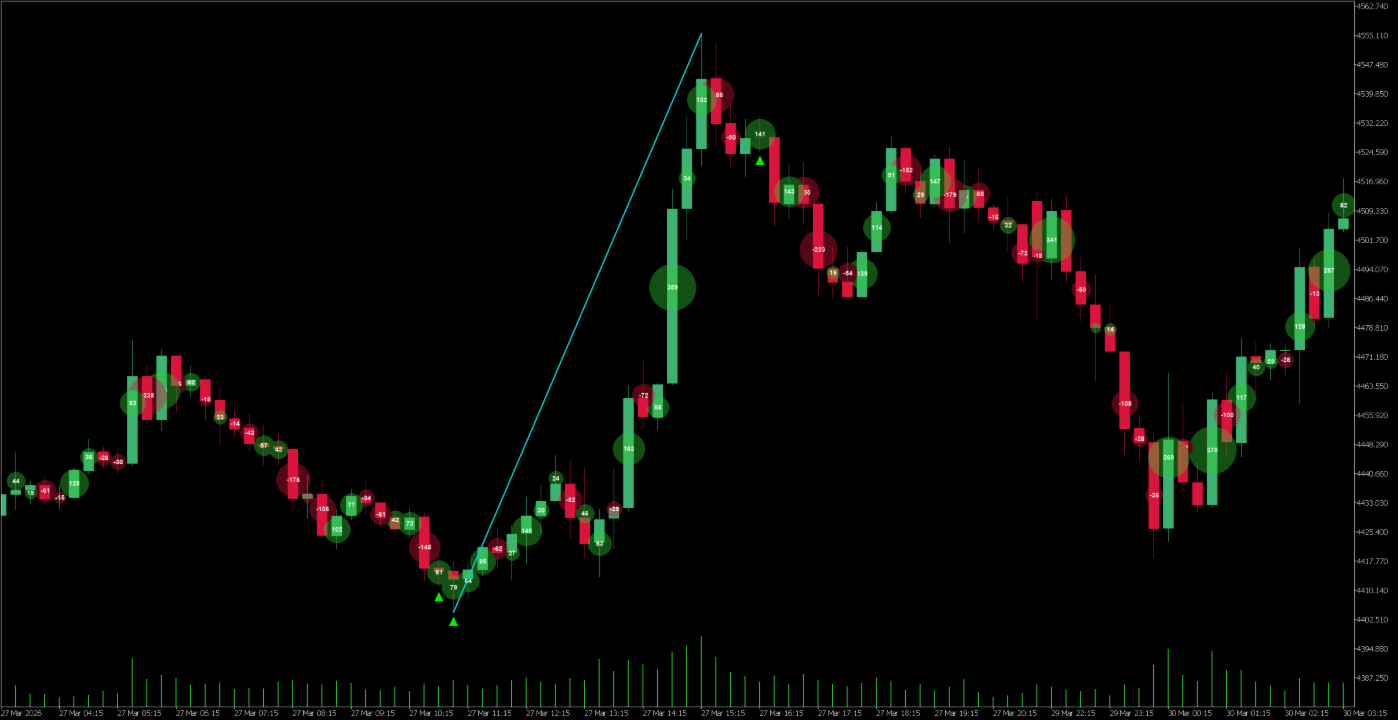 | Effort vs. Result identification | Large bubble + small candle body → big capital entered but price barely moved → potential reversal signal |