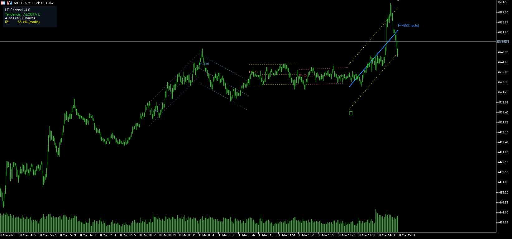 Linear Regression Channel v4.0 automatically finds the optimal channel length using the R² coefficient — and draws the full history of previous channels so you can see how the price structure evolved over time.