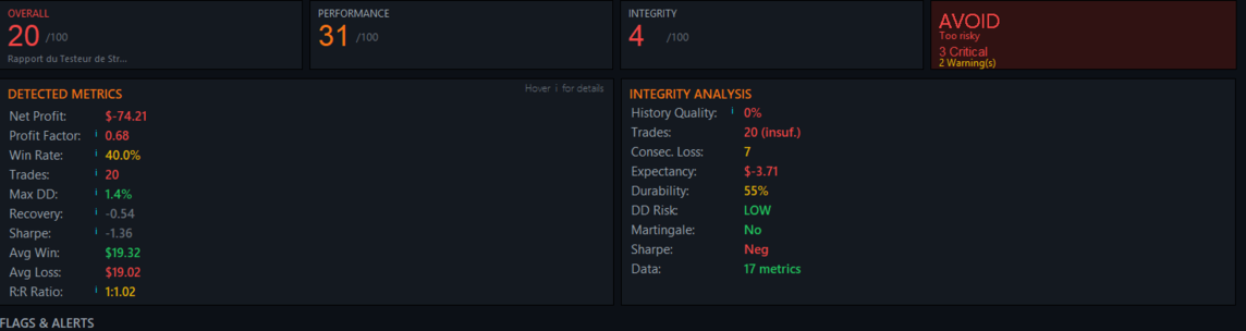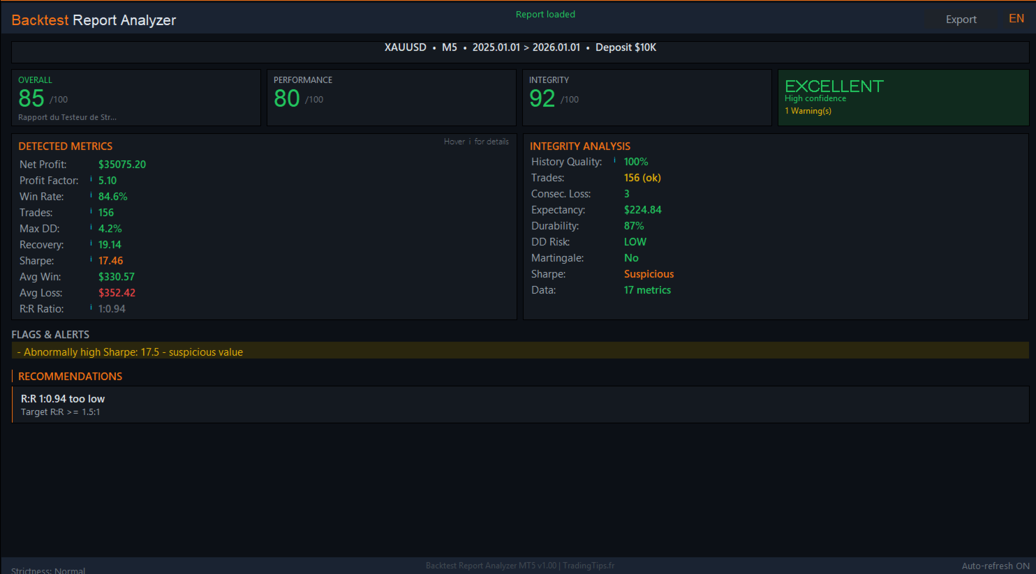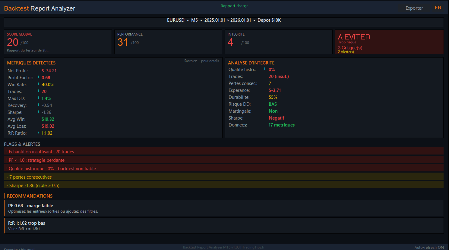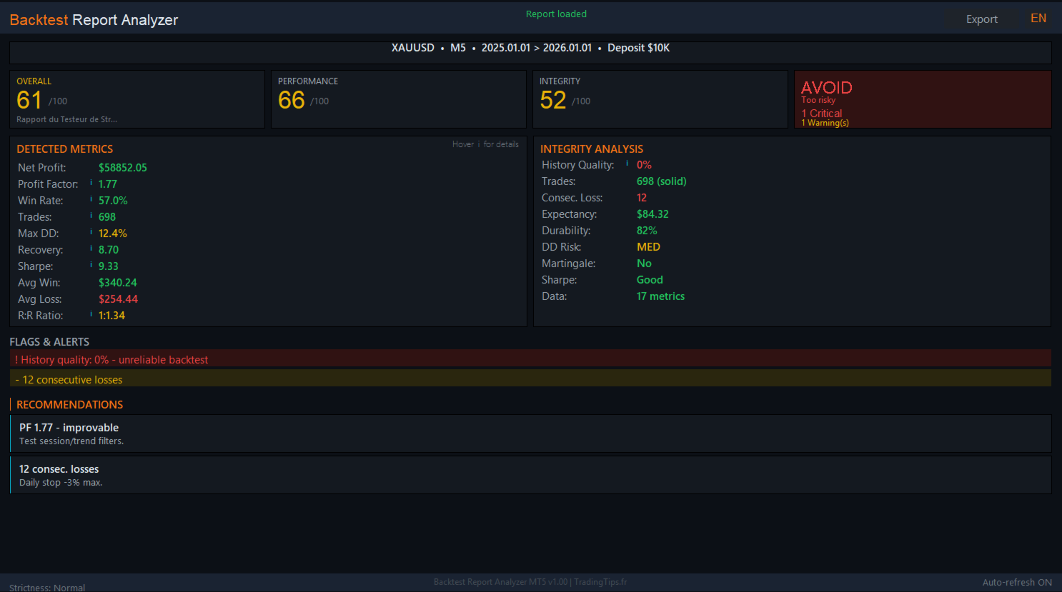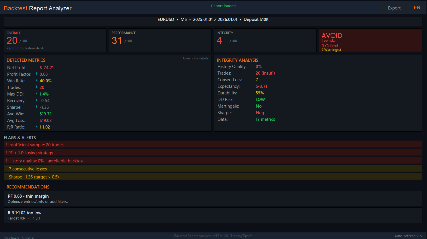 Backtest Report Analyzer MT5 e un indicatore MT5 per l'audit del backtest che legge qualsiasi report HTML dello Strategy Tester e fornisce un'analisi strutturata con punteggi, avvisi e raccomandazioni concrete. Valuta la qualita di qualsiasi backtest di Expert Advisor in pochi secondi.