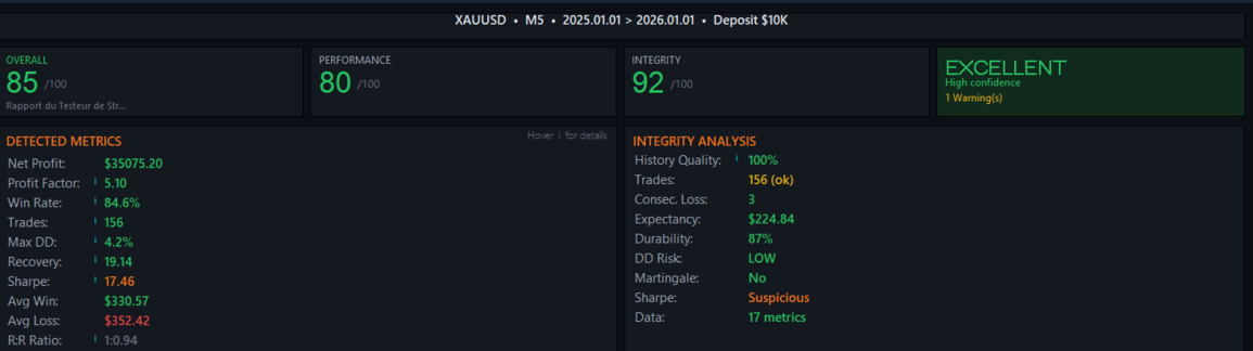 - Punteggio Globale (0-100): combina Prestazioni (60%) e Integrita (40%) per una valutazione oggettiva del tuo EA.