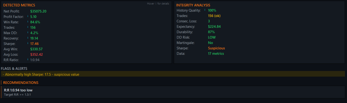 - Analisi di integrita: qualita dei dati di backtest, rilevamento martingala, coerenza dello Sharpe Ratio, completezza delle metriche.