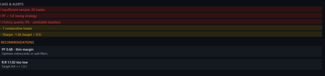 - Avvisi critici: martingala rilevata, campione insufficiente, drawdown estremo, strategia in perdita.