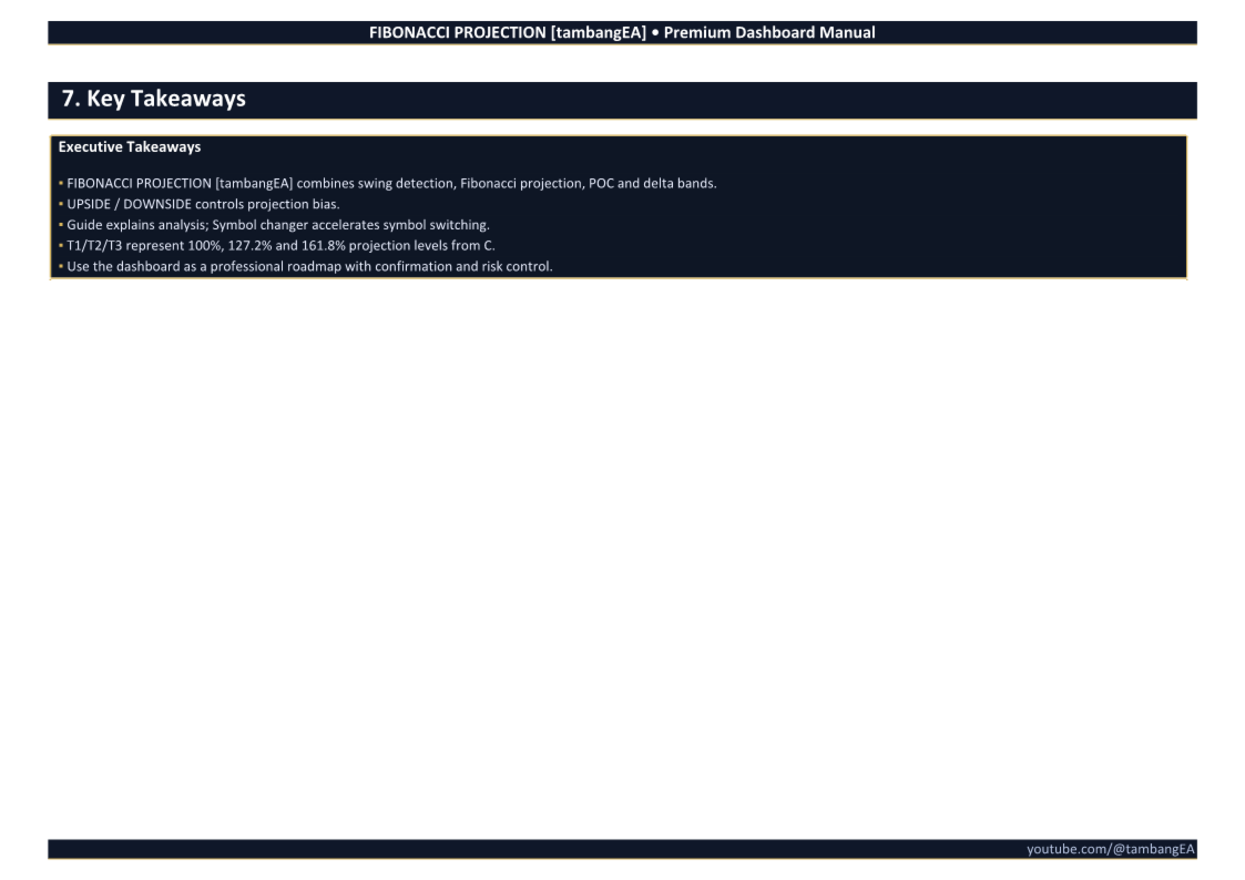 FIBONACCI PROJECTION [tambangEA] è uno strumento di analisi di trading professionale basato su dashboard, progettato per aiutare i trader a identificare la struttura del mercato, i target di proiezione di Fibonacci, le zone di reazione dei volumi e le aree di continuazione direzionale direttamente sul grafico.
