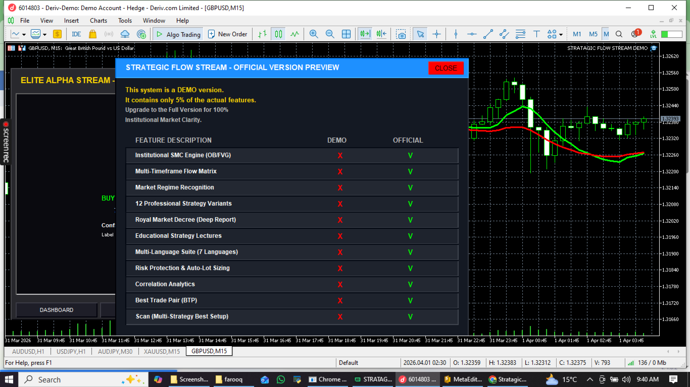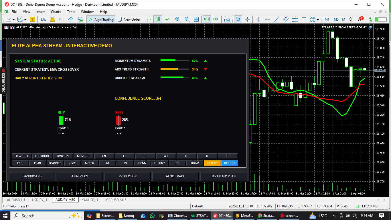 This Expert Advisor is designed to provide a professional-grade, interactive preview of our institutional trading technology. This version is a limited demonstration (approximately 5% of the full version's capabilities) , focusing on core crossover strategies and institutional-grade UI analytics to show you the potential of the Stratagic flow stream ecosystem.