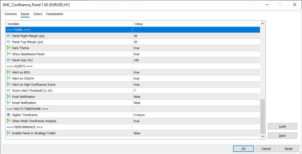 SMC Confluence Score MT5 scansiona 8 livelli di analisi istituzionale simultaneamente e genera un punteggio di confluenza bull/bear (0-10) in tempo reale.