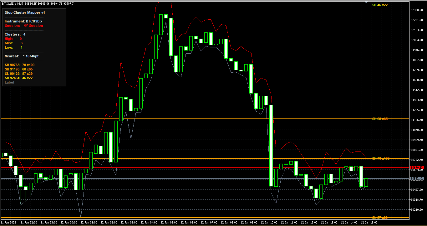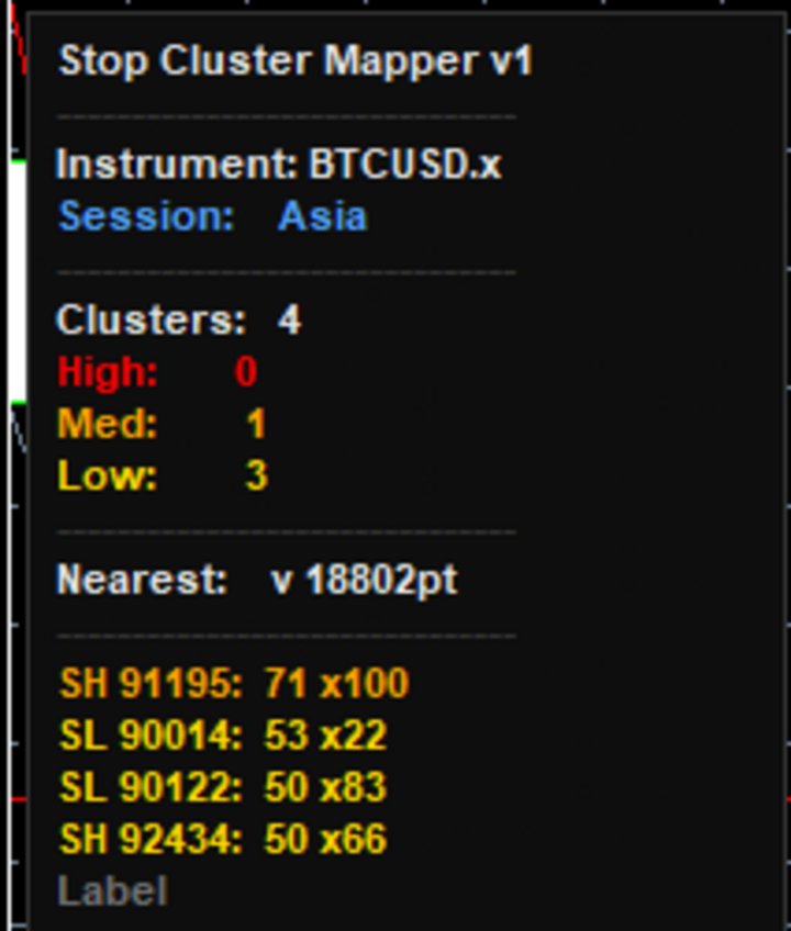 Stop Cluster Mapper is a technical analysis tool. It does not place trades, generate buy or sell signals, or constitute financial advice. It is intended as a confluence tool to support your own analysis and trading decisions. Past performance of any scoring methodology does not imply future results. All trading involves risk of capital loss. Session scoring accuracy depends on correct session time configuration. Verify that InpNYH, InpLonH, and InpAsiaH match