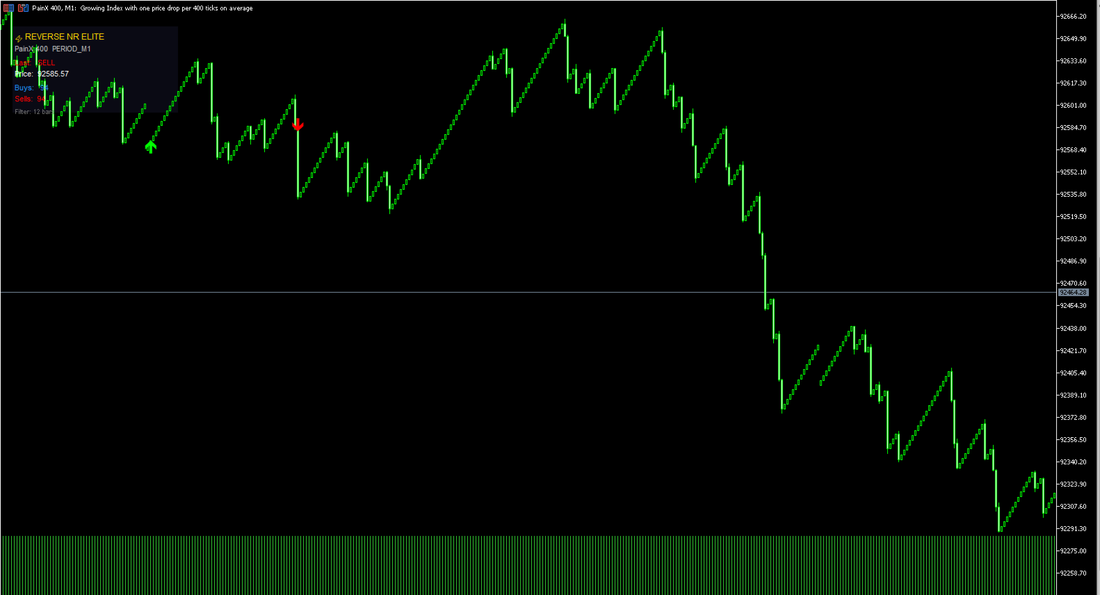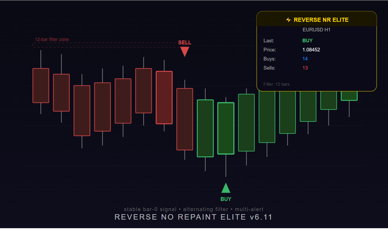 The indicator identifies potential trend reversal points on any chart by looking for a specific candle pattern. Its core logic checks whether the current bar has broken below (or above) the prior bar's high and low simultaneously, while also confirming that no candle within a lookback window (set by FilterCandle , default 12) exceeded that prior bar's extreme. In other words, it finds a bar that breaks cleanly out of a consolidation zone — a genuine momentum shift, not just noise.