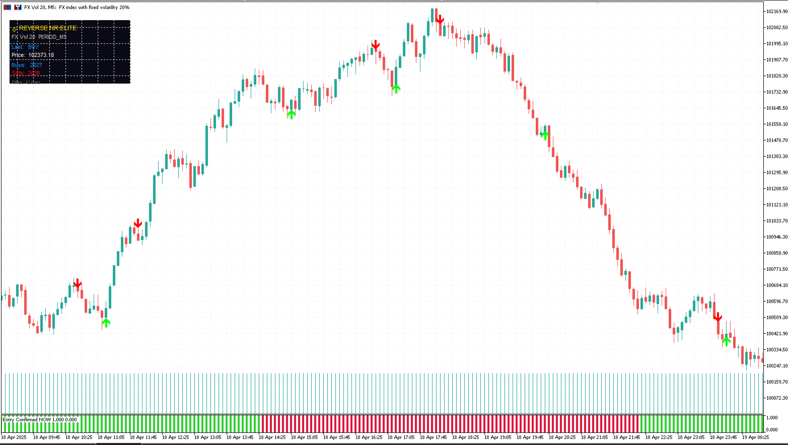 On top of that, it includes a live dashboard (position, colour, and content all configurable) showing the last signal direction, its price, cumulative buy/sell counts, and the active filter length. Alerts can fire via popup, push notification, email, or sound.