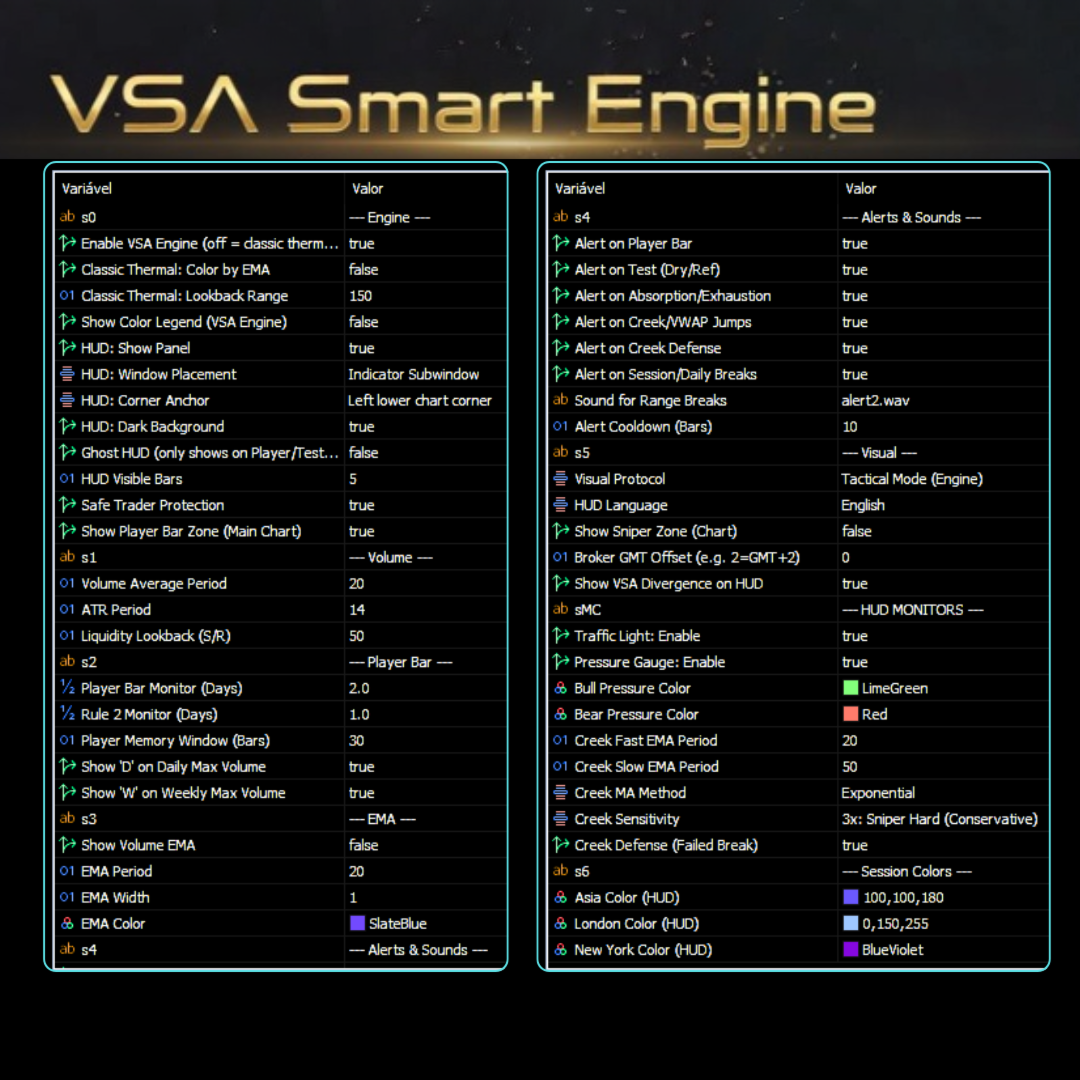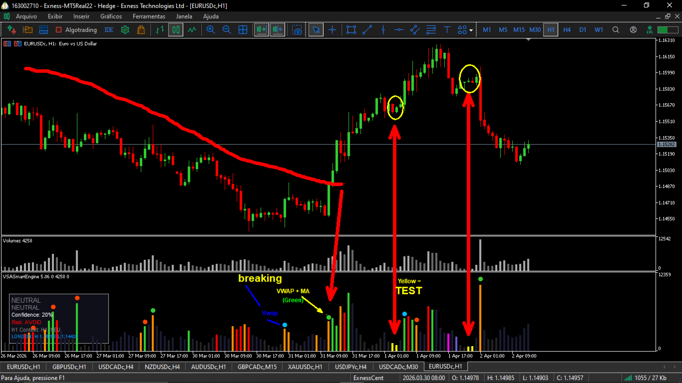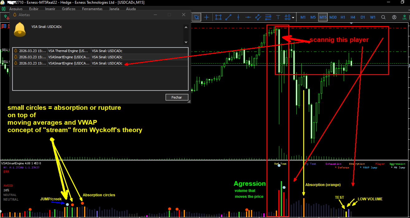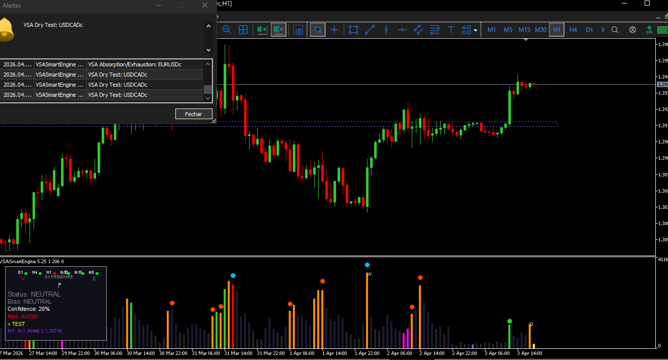 VSASmartEngine is a technical indicator for MetaTrader 5 based on VSA (Volume Spread Analysis) methodology. The system is designed to provide an objective reading of market activity, helping traders identify aggression, absorption, and exhaustion states by analyzing the relationship between volume and price action.