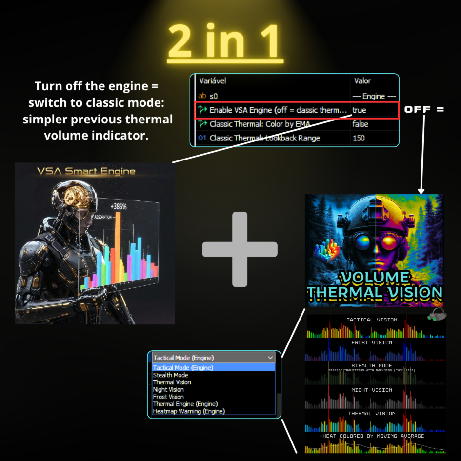 The indicator features a dual-processing architecture, allowing the user to switch between the full VSA logic engine or a simplified horizontal heatmap view for flow analysis.