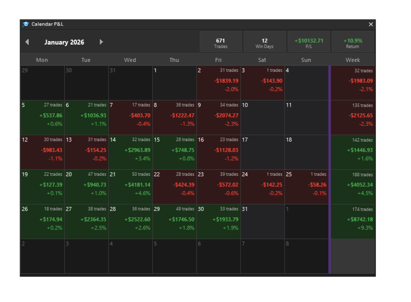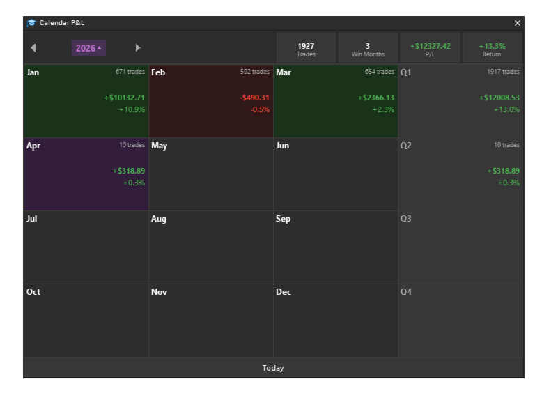 • P&L Calendar — Dialog displaying daily profit/loss within a month, with month/year navigation support.