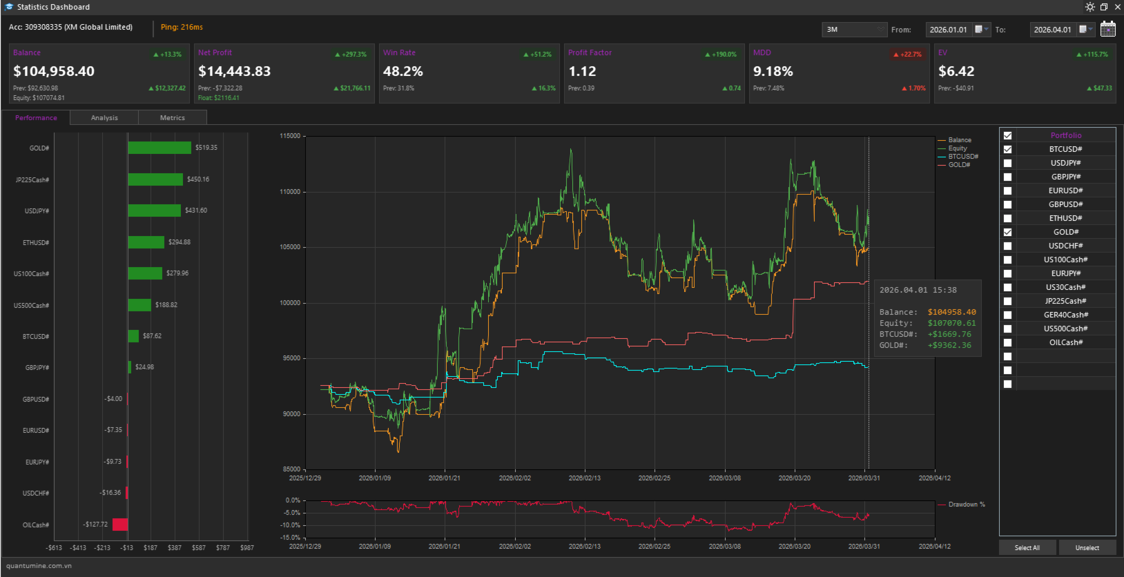 • Balance/Equity/Drawdown Chart — Hourly (H1) chart with Balance line, Equity line, and Drawdown area. The time axis automatically adjusts its format based on the visible range.